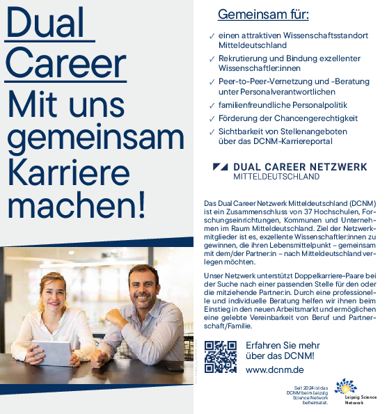 Unterstützt werden unsere Angebote durch das Dual Career Netzwerk Mitteldeutschland: Home | Dual Career Netzwerk Mitteldeutschland (dcnm.de)