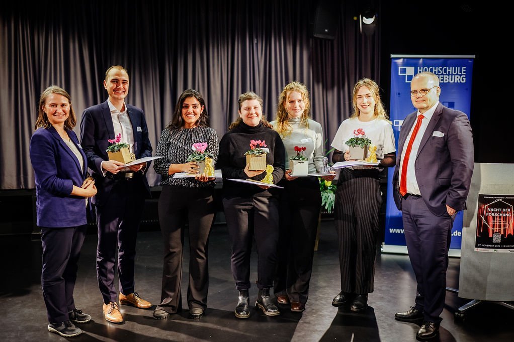 Den Höhepunkt des Abends bildeten die Science Pitches der Nominierten für die Forschungspreise 2025. Dabei präsentierten unsere Wissenschaftler*innen Ihre (Semester-, Bachelor-, Master und Promotions-) Projekte und Erkenntnisse allgemeinverständlich und überzeugend dem Publikum. Im Rahmen der Pitches ging es darum, die komplexen wissenschaftlichen Fragestellungen und Forschungsergebnisse in einer klaren, prägnanten und unterhaltsamen Weise innerhalb von fünf Minuten darzustellen und damit das Interesse des Publikums zu wecken sowie für die Bedeutung und Relevanz der vorgestellten wissenschaftlichen Arbeit zu begeistern.