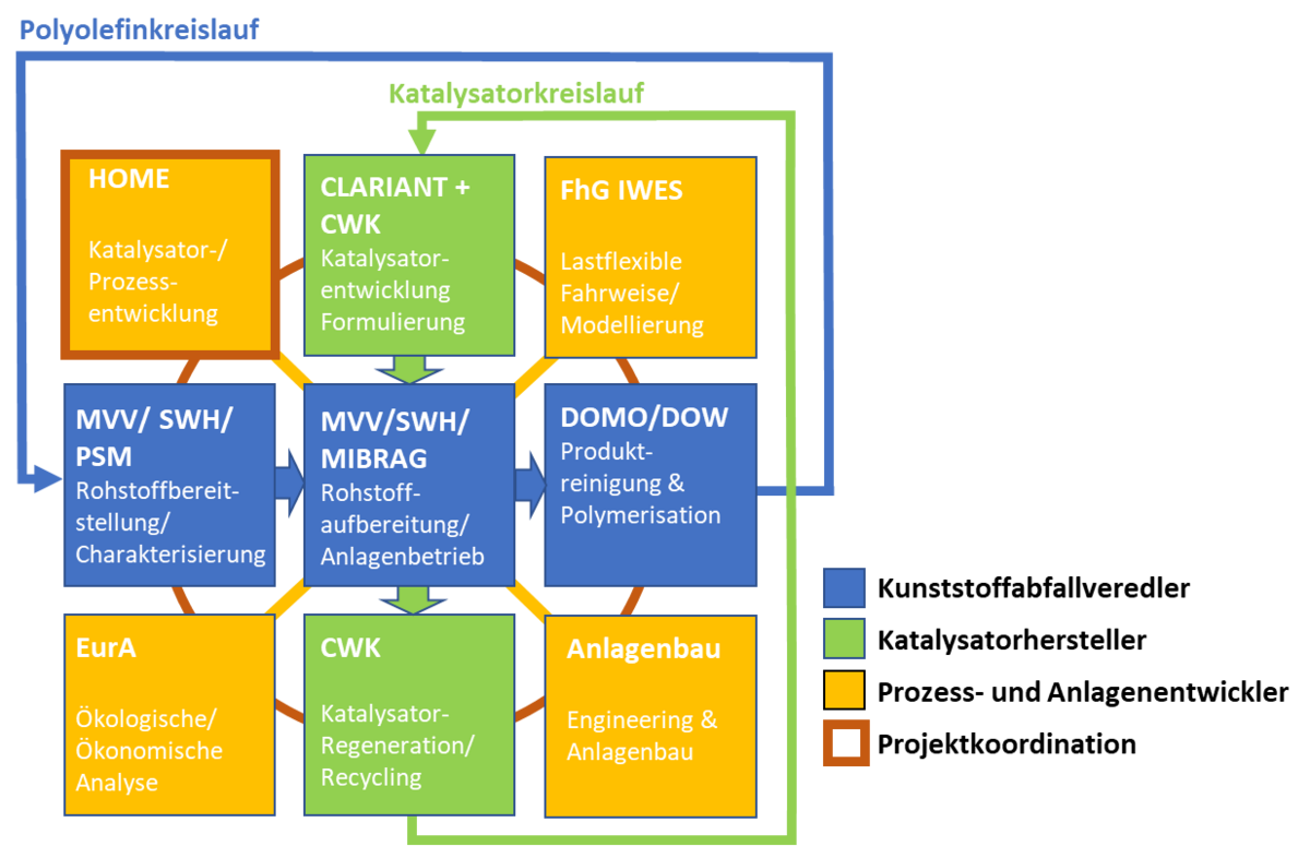 In einem interdisziplinären Team aus 12 Partnern planen wir bis 2029 die Technologie der katalytisch gestützten Pyrolyse zu einem industriellen Prozess weiter zu entwickeln. Dabei vereinen wir die Expertise namhafter Chemieunternehmen und Kunststoffhersteller, Spezialisten für Katalysatorherstellung und -Formulierung sowie weiterer Unternehmen des Anlagenbaus und der Kreislaufwirtschaft mit in der Region vorliegenden institutionellen Forschungseinrichtungen.