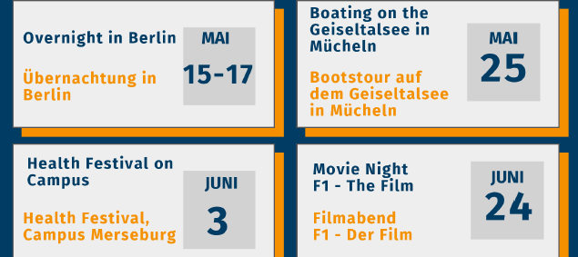 Apart from helping you solve any problems you may have, our student buddies will organise trips and social events for you. These social 'get-togethers' are intended to help you quickly get to know other people and make new friends. Our buddies will inform you regularly via our Facebook group International Students Merseburg or post important events on Instagram.
