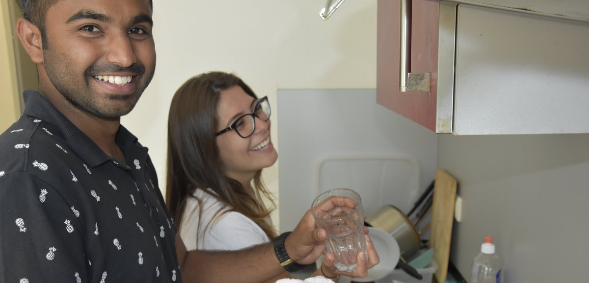 Guest rooms are available directly on campus for your planned study visit. The rooms are fully furnished. Mattress, bed cover, pillow and bed linen are provided. All necessary household items (such as cooking utensils, pots and pans, cutlery and kettle) are available in the communal kitchen. Two bathrooms are shared with five to six flatmates. The common area is equipped with tables, chairs and a TV. All rooms have high-speed internet access.