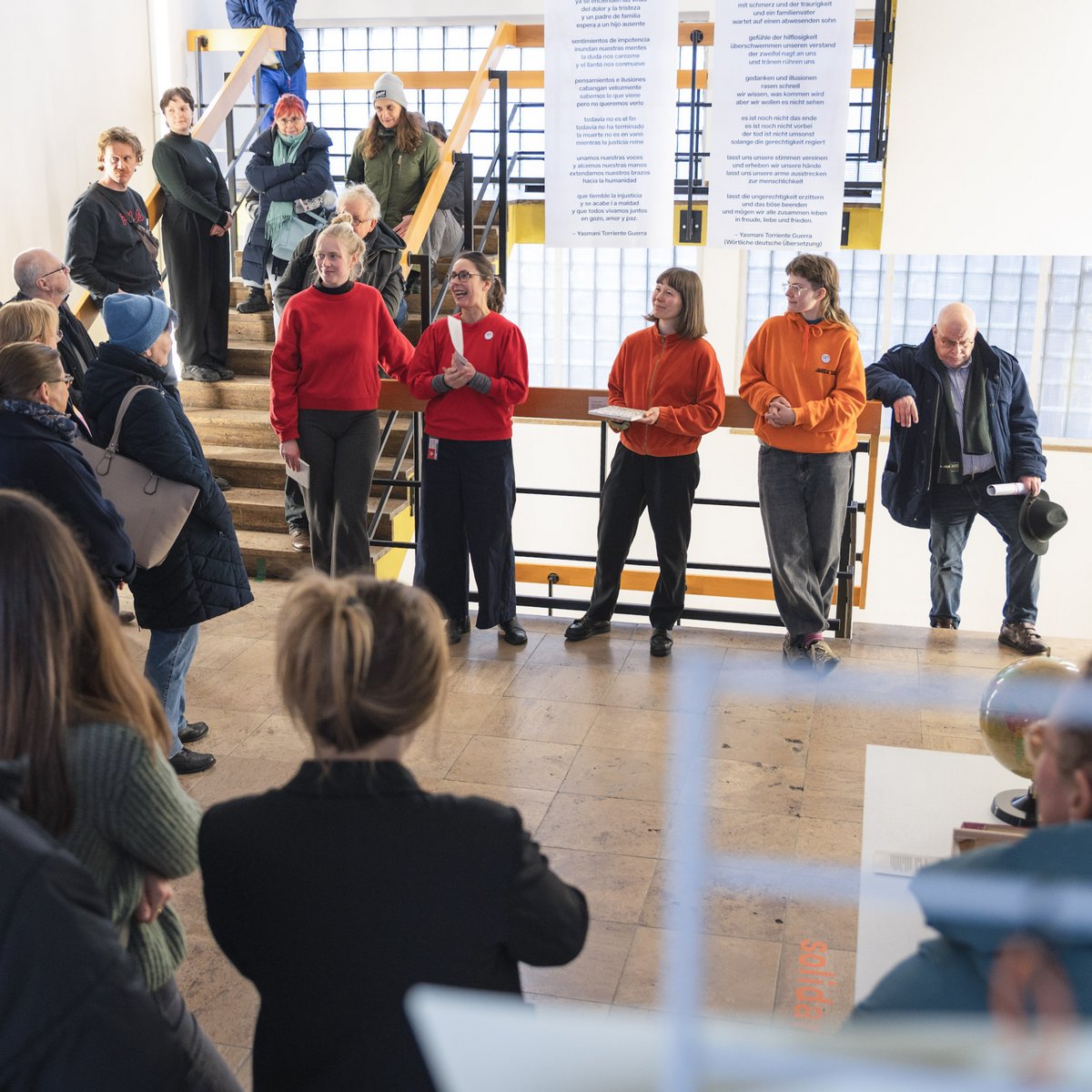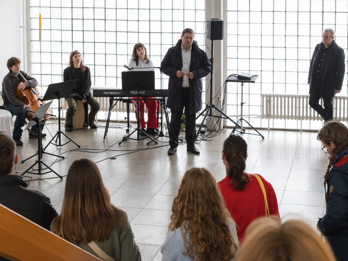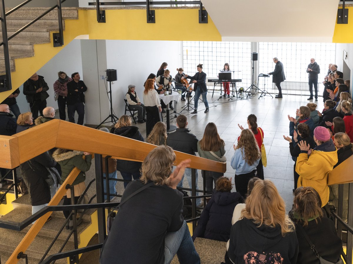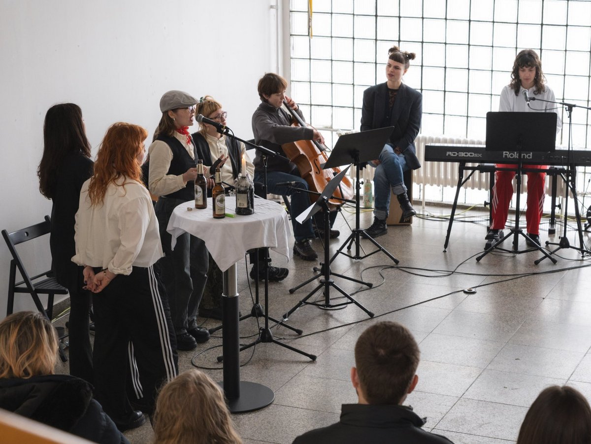 Die Vernissage am 28. Januar 2026 eröffnete mit einer Performance aus Musik, Gesang und Sprechakten von Studierenden aus dem Lehrbereich Musik und auditive Medien in Praxis, Produktion und Vermittlung unter Leitung von Frank Venske. In unterschiedlichen musikalischen Stilen wie Chanson, Liedermacher bis hin zu Rap wurden poetisch, kritisch und ironisch Fragen nach der Rolle der Frau, nach Gleichberechtigung und gesellschaftlichen Zuschreibungen von Solidarität reflektiert und interpretiert.