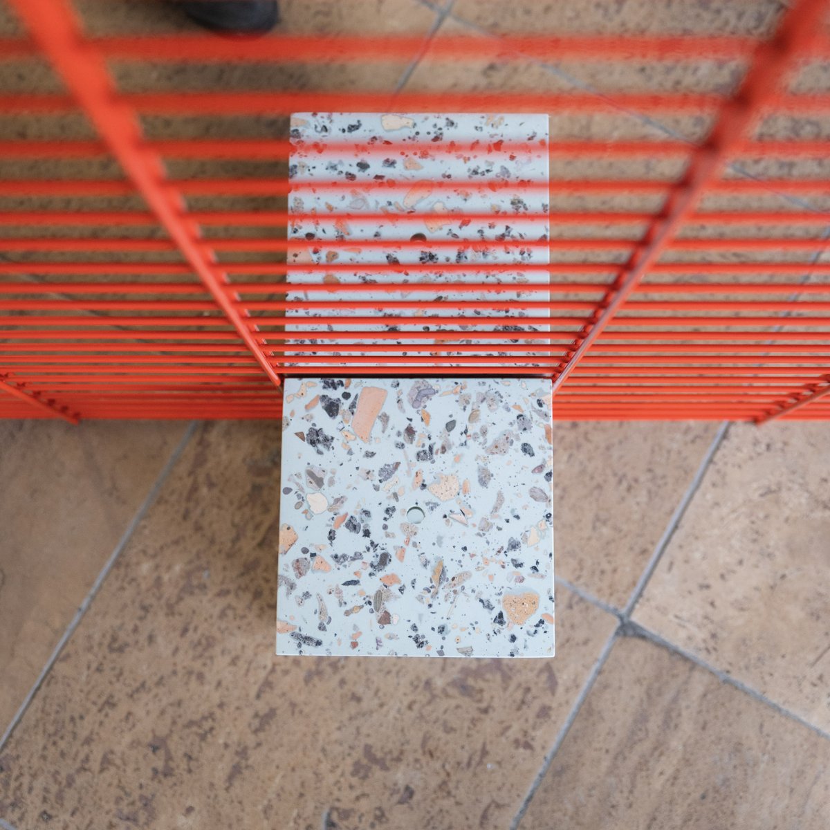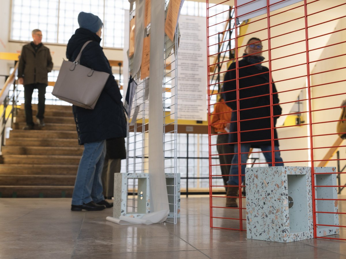 Es beinhaltet selbst einen Teil Campusgeschichte: Die Terrazzo-Steinblöcke, die als Basis und Gewichthalterung der Ausstellungsdisplays dienen, bestehen aus Schottermaterial, das vom Teilabriss des Forschungsgebäudes der Hochschule Merseburg gerettet und anschließend aufgearbeitet wurde.