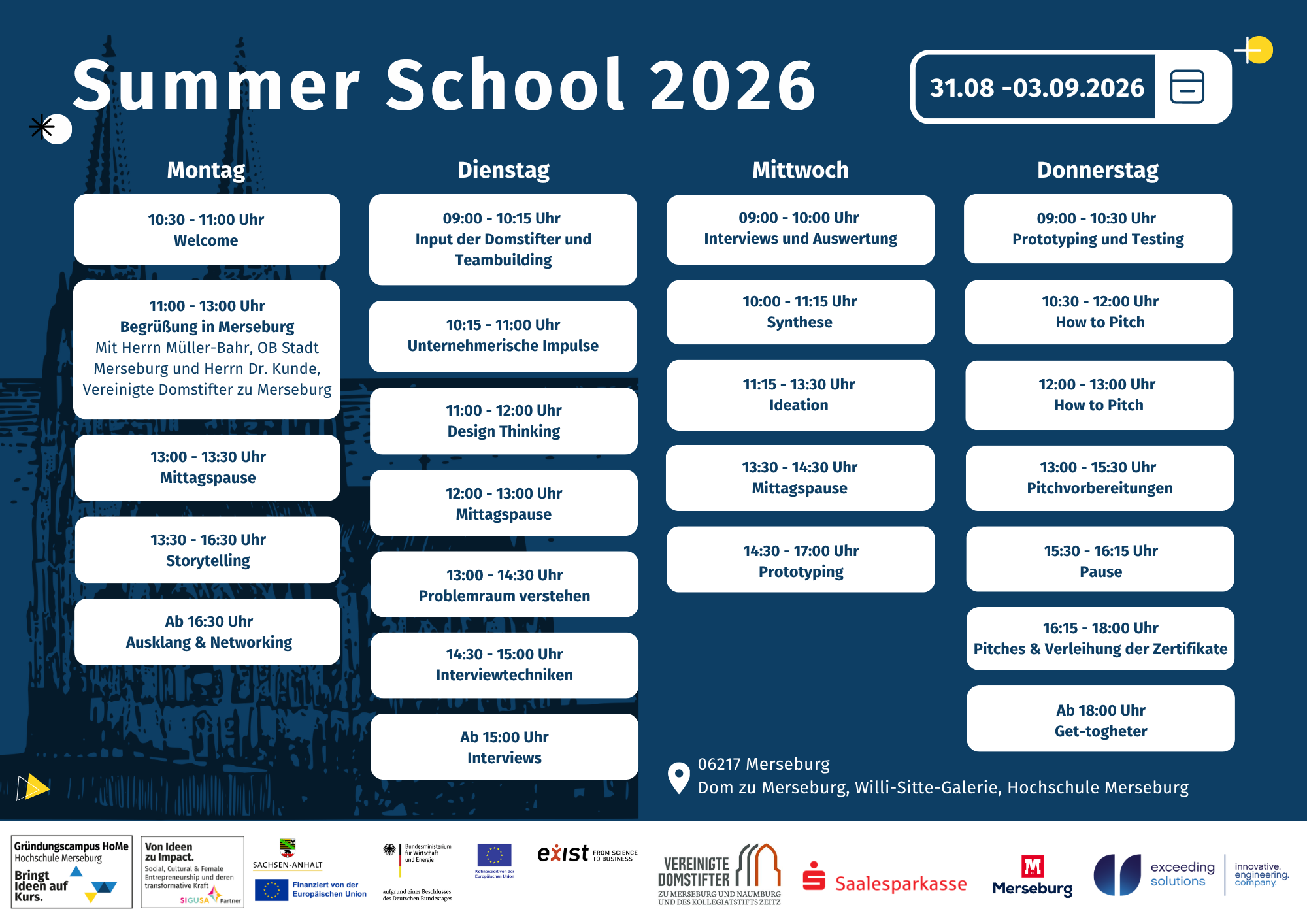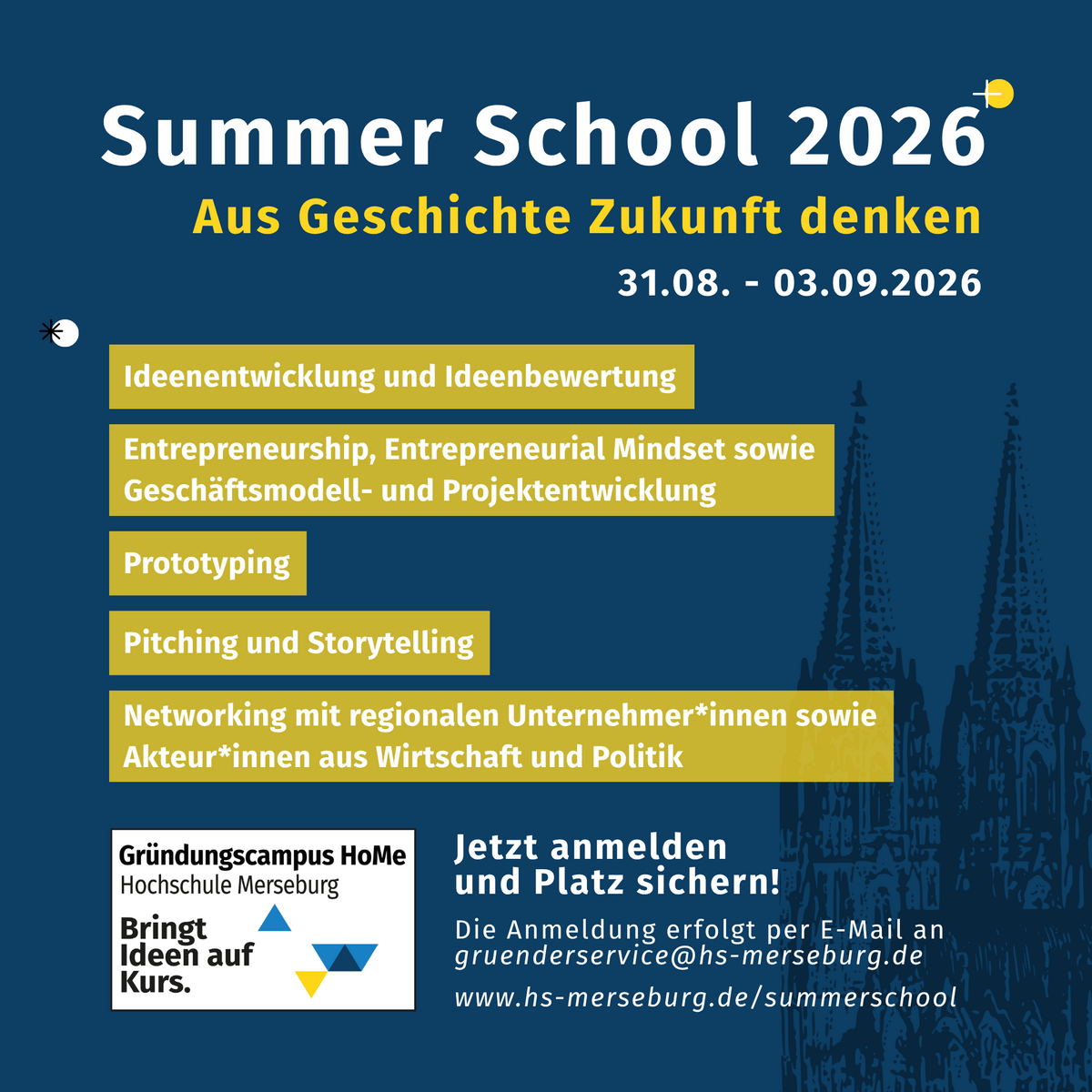 Vom 31. August bis 03. September 2026 veranstaltete der Gründungscampus HoMe der Hochschule Merseburg die Summer School 2026 – eine Workshopwoche rund um die Entdeckung von Potenzialen, die Förderung unternehmerischen Denkens und die Entwicklung potenzieller Geschäftsmodelle. Unter dem diesjährigen Motto „Aus Geschichte Zukunft denken“ arbeiteten die Teilnehmenden in interdisziplinären Teams an Ideen, insbesondere zur Öffnung und zukunftsorientierten Nutzung des Merseburger Doms. Realisiert wird die Woche in direkter Kooperation mit den Vereinigten Domstiftern zu Merseburg und Naumburg sowie dem Kollegiatstift Zeitz.