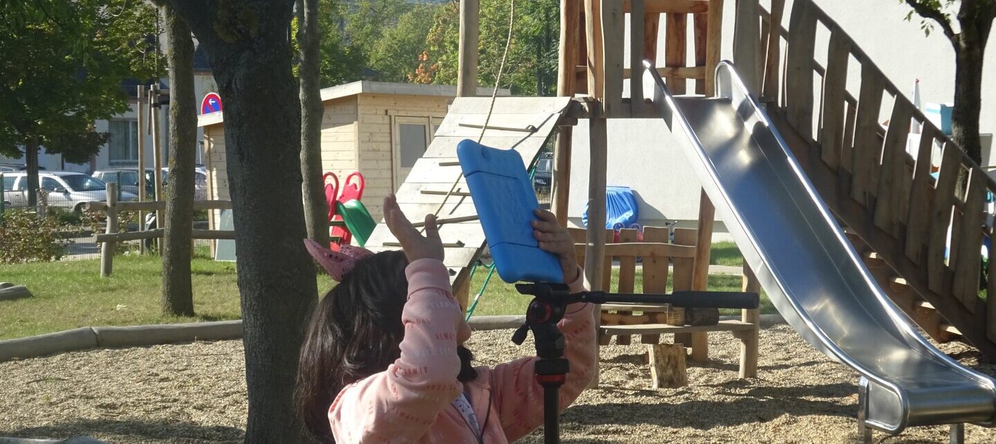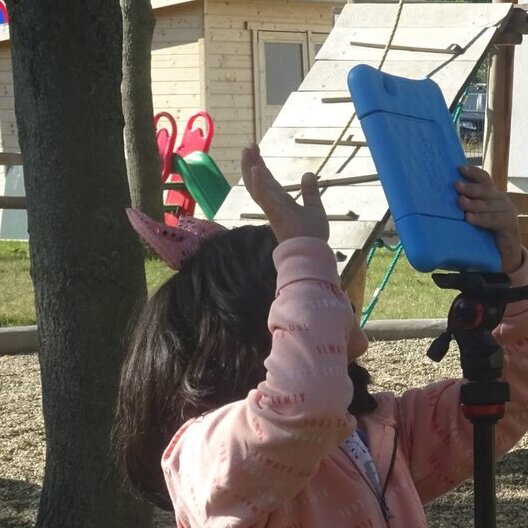 Wir möchten unsere Ideen gerne in die Welt tragen und mit Pädagog*innen anderer Kitas teilen. Dafür haben wir einen Tutorialfilm gedreht der ein Gerät und dessen Anwendungsmöglichkeiten erklärt. Unsere Wahl fiel auf das Tablet und zwei Anwendungen, welche bei den Kindern in unserer Testphase besonders beliebt waren: die Kamerafunktion und eine Audio-App zum Aufzeichnen von Geräuschen. Der Film zeigt, wie das Tablet mit diesen beiden Anwendungen in der Kita ohne viel Vorbereitung und technisches Wissen mitten im Alltag genutzt werden kann. Den Rahmen stellen zwei Spielideen dar, welche die Kinder selbst erfunden haben: Die Ton-Entdeckungsreise und die Detail-Schatzsuche.