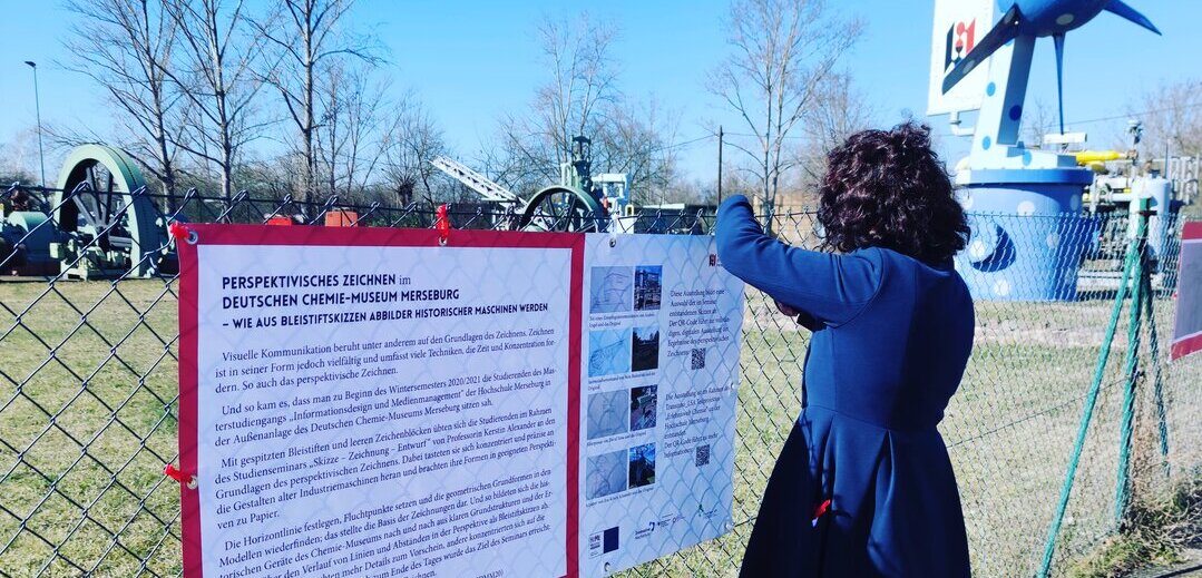 Zu Beginn des Wintersemesters 2020/2021 haben die Studierenden des Masterstudiengangs „Informationsdesign und Medienmanagement“ der Hochschule Merseburg in der Außenanlage des Deutschen Chemie-Museums Merseburg ihre Skizzen dementsprechend angefertigt.
