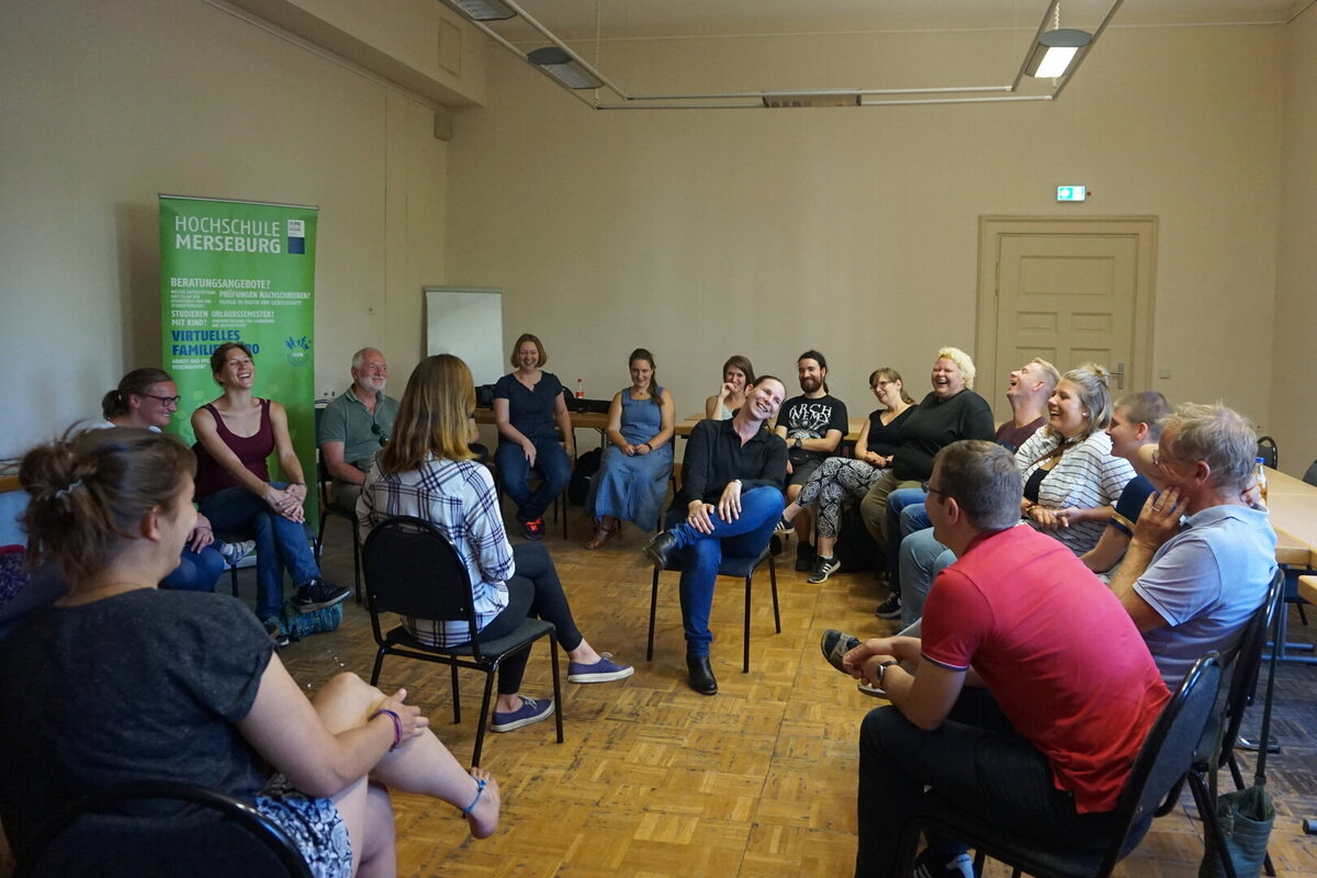 Nach einem herzlichen Empfang hatten die Gäst*innen die Möglichkeit, an einem von drei parallellaufenden interaktiven Angeboten teilzunehmen. Ein Format war ein Live-Interview, mit Promovierenden der Hochschule Merseburg “The Scientist’s Journey”. Hier konnten Fragen und Ideen rund um das Thema intensiv diskutiert werden. In dem Workshop von Christian Peine "Maker-Tools in der Medienpädagogik”, hatten die Teilnehmenden die Möglichkeit, mit verschiedenen Maker-Tools wie 3D-Modellierung und -Druck, programmierbare Mikrocontroller, VR-Brillen und weitere Technologien auszuprobieren und kreativ zu experimentieren. Ein weiteres Highlight war ein Workshop von Prof. Dr. Cepus, dieser lieferte spannende Einblicke in die Seifenherstellung und thematisierte folgende Fragen: Was muss man alles beachten, wenn man Seife selbst herstellt? Welche Chemikalien sind überhaupt nötig und wie lange muss eine Seife aushärten?