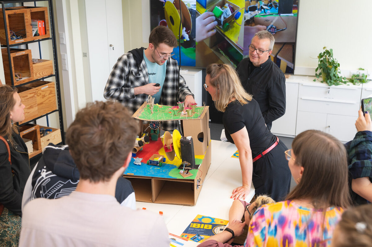 Aarons Thema seiner diesjährigen künstlerischen Projektarbeit steht ganz unter dem Motto „Bauen, Basteln, Selbermachen“. Im Rahmen seines Bachelorstudiums entwickelte Aaron ein kreatives und zugleich bildungsorientiertes Projekt unter dem Titel „Mini-Bib: Wir bauen eine interaktive Bibliothek“. Ziel war es, digitale Kompetenzen bei Kindern auf spielerische Weise zu fördern – und zwar dort, wo sie sich ohnehin gern aufhalten: in der Bibliothek.Die Idee zu dem Projekt entstand während Aarons Praktikum in der Stadtbibliothek Merseburg. Geprägt durch seine Studienerfahrungen im Bereich Making und inspiriert vom Ansatz „Learning by Making“ von Sandra Schön, wollte Aaron einen praktischen Beitrag zur Vermittlung digitaler Literalität leisten. Diese versteht er als zentrale Fähigkeit, um sich reflektiert und selbstbestimmt in einer zunehmend digitalen Welt zurechtzufinden.