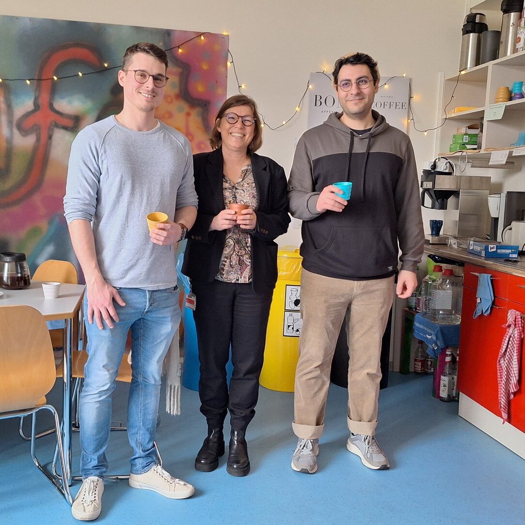 Prof. Dr. Beate Langer testet zusammen mit Mervan Haji (rechts) und Eduard Putsch (Produktionsleiter der Firma Exipnos) die Beschaffenheiit von Bechern aus biobasiertem und bioabbaubarem Kunststoff