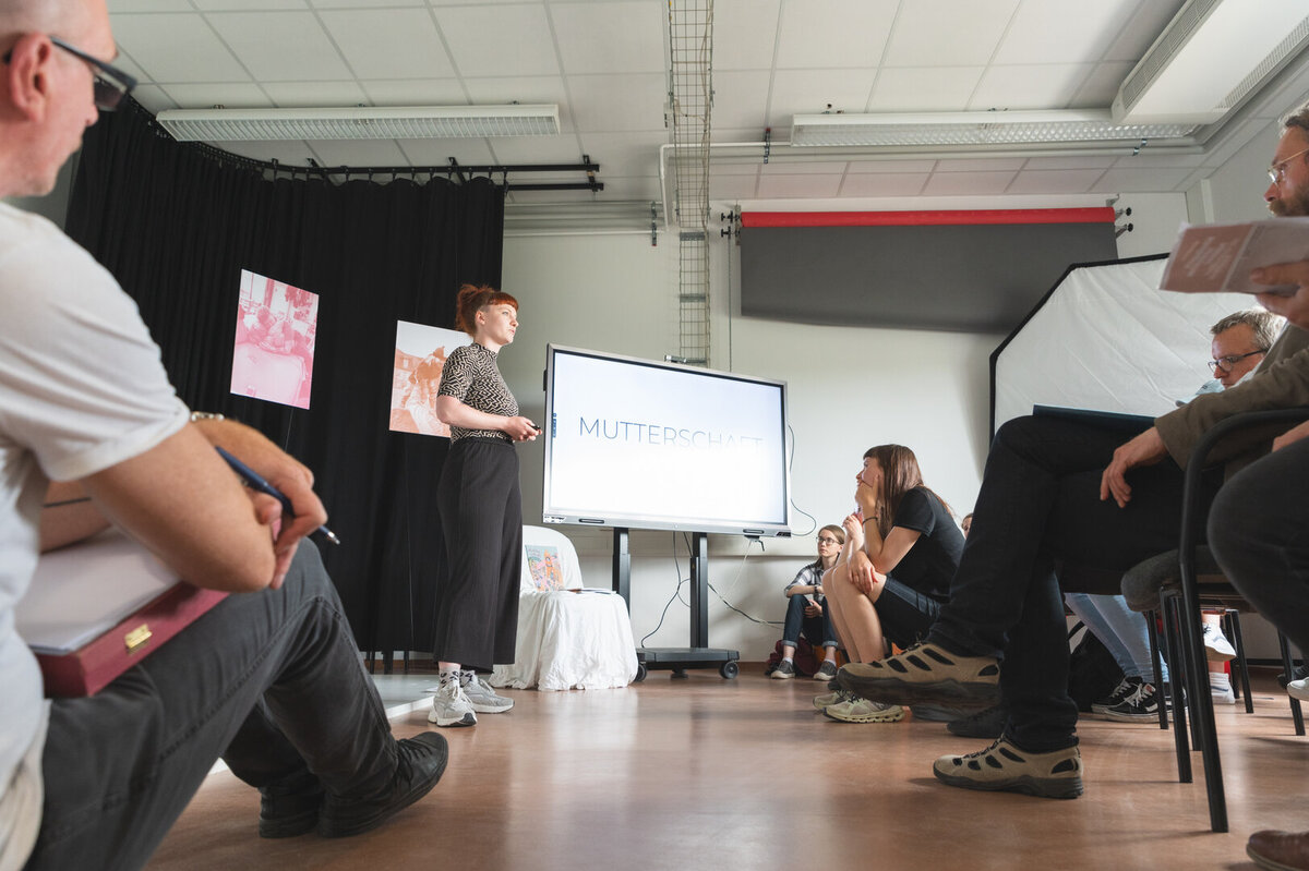 Mit ihrem Projekt „Mutterschaft“ ginge es nicht gegen Väter oder Männer, erklärt Anne Martha Hilliger ausdrücklich. „Mit meinem Fotobuch möchte ich lediglich den Aspekt zeigen, dass es einer Mutter freigestellt sein darf, sich aus dem Narrativ, dass nur eine hetero-normative Kleinfamilie, bestehend aus Vater, Mutter und Kind, gut und gesund für das Kind sei, herausziehen zu können“, sagt die KMP-Studentin. Sie habe während des Studiums in einer WG mit zwei getrennt erziehenden Müttern gewohnt. Durch viele gemeinsame Gespräche sei schließlich die Idee entstanden, deren Leben fotografisch und erzählerisch festzuhalten. Ergänzend habe sie Mareice Kaisers Buch „Das Unwohlsein der modernen Mutter“ (Rowohlt, 2021) gelesen und sich bestätigt gefühlt, dass viele Erwartungshaltungen an Mütter fernab der Realität seien. „In meinem Fotobuch habe ich von mir erstellte Fotos mit Texten von fünf Müttern kombiniert. In den Texten geht es unter anderem um die individuelle Betrachtung der persönlichen Mutterschaft“, sagt Anne. Zweifellos bleibt es ein für die Zukunft relevantes Thema. Aus ihrem Studium habe sie viel für ihre eigene Zukunft mitnehmen können, ergänzt sie. Sie habe an der Hochschule sowohl den praktischen Ansatz als auch die gelebte Augenhöhe, auf der sie vielen Dozierenden begegnen durfte, gemocht. Nach ihrem Abschluss werden bei Anne weiterhin Schnittstellen von Bildung, Technologie und Gemeinschaft im Fokus stehen.