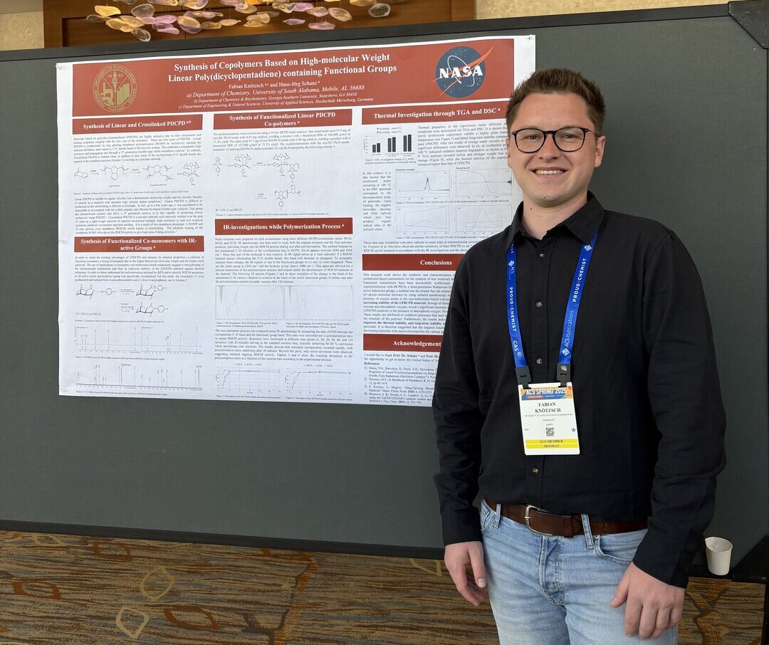 Gemeinsam mit einem internationalen Forschungsteam arbeitete Fabian Knötzsch an der University of South Alabama an einem von der NASA geförderten Projekt zur Entwicklung neuartiger Kunststoffe unter anderem für die Luft- und Raumfahrt. Dabei beschäftigte er sich mit der Katalysatorentwicklung und der Synthese hochmolekularer Polymere, die besonders hitzebeständig, langlebig und perspektivisch auch recyclingfähig sind – ein Thema, das nicht nur für Raumfahrtunternehmen, sondern auch für die Kunststoffindustrie und nachhaltige Produktion enorme wirtschaftliche Relevanz besitzt.