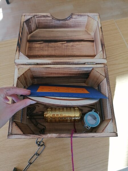 Das Briefing zum Projekt lautete: In diesem Projekt entwickelt ihr eine "Adventure-Box" inspiriert von verschiedenen Genres von Jugendbüchern. Eine Adventure-Box funktioniert ähnlich wie ein Escape Room: Sie ist ein Spiel, bei dem ihr eine Geschichte erlebt und Rätsel löst. Während es bei einem Escape Room oft darum geht, aus einem Raum zu entkommen, liegt das Ziel bei einer Adventure-Box darin, sie zu öffnen und ihr Geheimnis zu lüften. In ihr findet man mysteriöse Gegenstände, Codes, Schlüssel, Geräte und Behälter, die es zu nutzen, zu kombinieren oder zu wiederum zu öffnen gilt. Am Ende hat man es geschafft: die verschwundene Goldmünze ist freigespielt, eine Videobotschaft auf einem QR-Code ist entschlüsselt oder die Schatzkarte/der Brief wurde gefunden - was auch immer sich am Ende eurer Geschichte verbirgt.