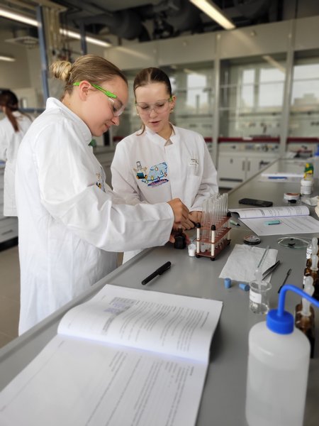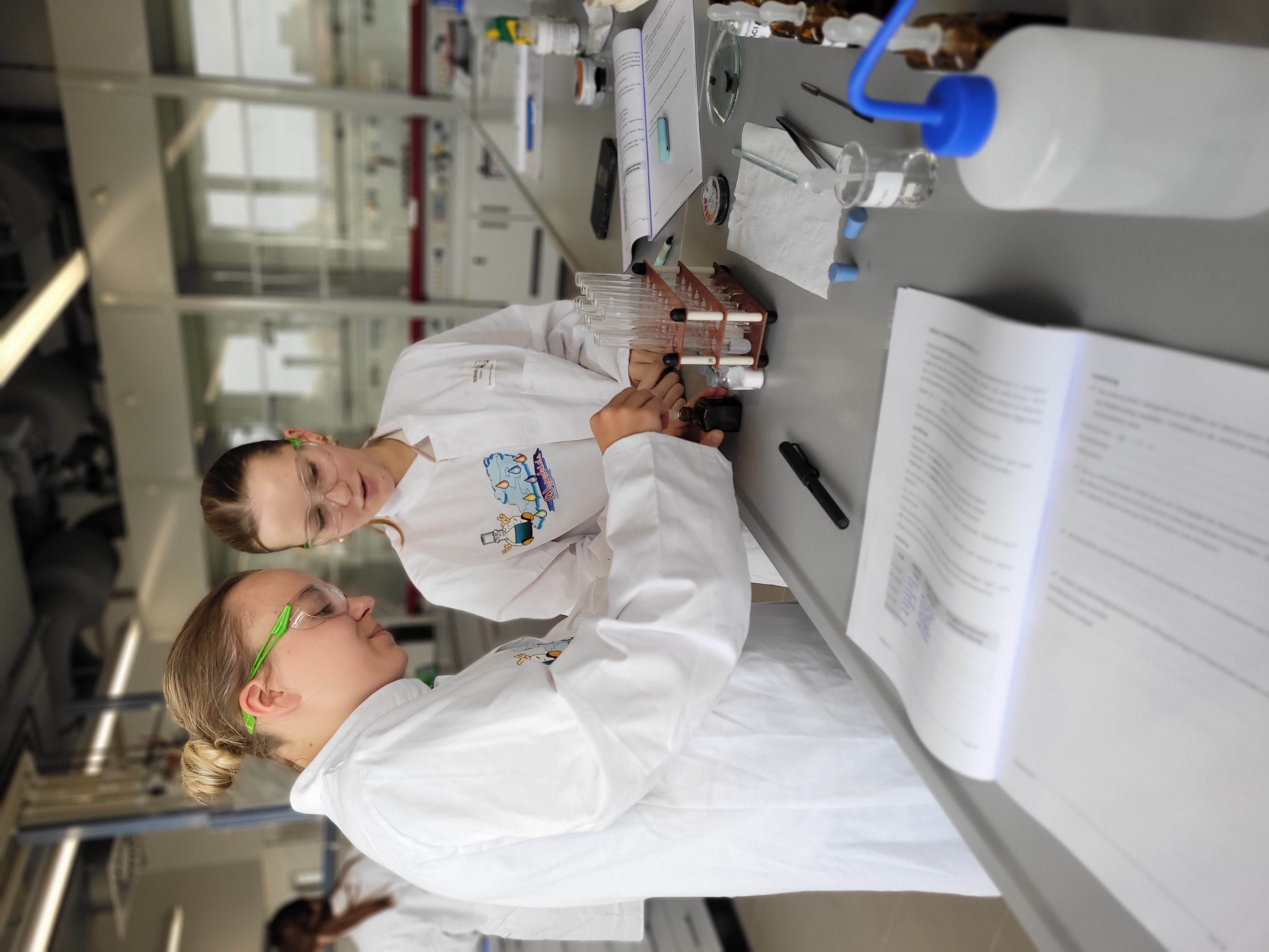 In 2er-Teams experimentierten die jungen Chemiker im Labor zu den Themen Natürliche Säure-Base-Indikatoren,Ionennachweise sowie Herstellung von Kosmetikprodukten. Dabei wurden erste Einblicke in wissenschaftliches Arbeiten und Experimentieren vermittelt. Ergänzend zum Praktikum fand im Hörsaal der Hochschule eine Vorlesung zum Thema „Kunst kommt von Können – Was Kunststoffe alles leisten“ mit Herrn Auerbach statt.