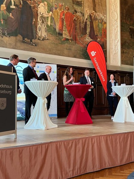 Am 31.05.2022 wurde im Ständehaus Merseburg der 6. Gründerpreis des Landkreises Saalekreis verliehen. Der Oberbürgermeister der Stadt Merseburg Jens Bühlingen und der Landrat des Saalekreises Hartmut Handschak richteten zu Beginn ein Grußwort an die Gäste, unter denen sich viele Gründer*innen, Unternehmen aus der Region, Netzwerkpartner*innen und Vertreter*innen von Förderinstitutionen befanden. Beide betonten die Bedeutung der Gründer- und Unternehmenskultur für die Region.