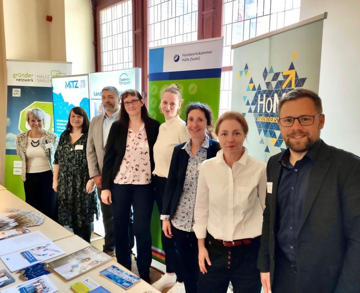 Anschließend fand der Expertentalk statt, bei dem die Entwicklung der Gründungsszene im Saalekreis sowie die unternehmerischen Herausforderungen der Region von Dirk Neumann (Hauptgeschäftsführer der Handwerkskammer Halle), Tobias Voigt (Leiter der IHK-Geschäftsstelle Weißenfels), Kathrin Schaper-Thoma (Geschäftsführerin des Merseburger Innovations- und Technologiezentrums), Anna-Sophia Werther (Geschäftsführerin der Werther GmbH) sowie Prof. Dr. Uwe Heuert (Geschäftsführer der exceeding solutions GmbH) und Prof. Dr. Markus Krabbes (Rektor der Hochschule Merseburg) diskutiert wurden.