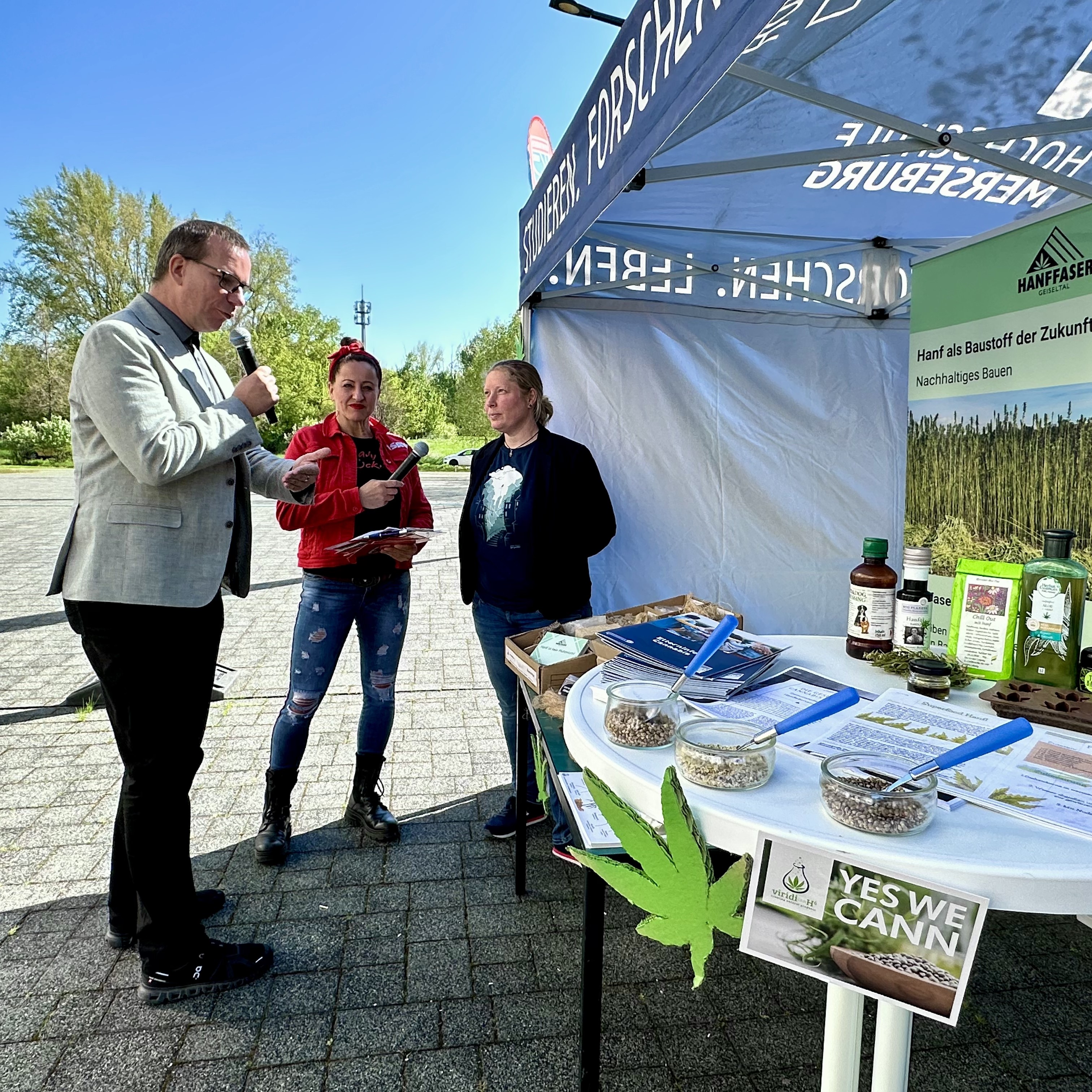 Auch die Nachwuchsgruppe „Bio-Rohstoffe“ präsentierte sich mit einem Informationsstand. Das Team stellte aktuelle Forschungsarbeiten rund um den Rohstoff Nutzhanf vor. Besucher*innen konnten erfahren, wie die Pflanze in der Bioökonomie eingesetzt wird – von der Verwendung in Lebensmitteln und Kosmetika bis hin zu innovativen Baustoffen. Die Forschenden erklärten anschaulich, wie Hanf zu einer nachhaltigen Entwicklung in Strukturwandelregionen beitragen kann und welche Rolle die interdisziplinäre Forschung dabei spielt.