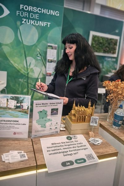 Im Rahmen der Grünen Woche bot sich die Gelegenheit, Besucherinnen und Besuchern der Sachsen-Anhalt-Halle in einer Mini-Umfrage zu befragen, ob sie bereit wären, für touristische Angebote einen höheren Preis zu zahlen, sofern deren Qualität durch unabhängige Zertifizierungen bestätigt ist. Mit knapp 200 Ja/Nein-Abstimmungen und rund 150 ausgefüllten Fragebögen konnte vor Ort ein aussagekräftiges Stimmungsbild gewonnen werden.