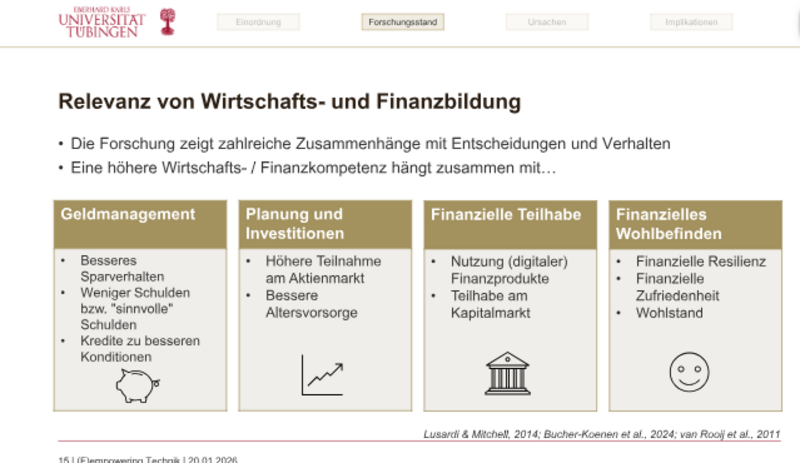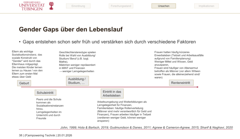 Im Rahmen der Vorlesungsreihe (F)empowering Technik hielt Lucy Haag am 20.01.2026 den Vortrag "Gender Gaps in der Finanz- und Wirtschaftskompetenz: Aktuelle Forschungsergebnisse und Erkenntnisse für die Praxis“. In ihrem Vortrag beleuchtete Lucy Haag von der Universität Tübingen geschlechtsspezifische Unterschiede in der Wirtschafts- und Finanzkompetenz und deren weitreichende Folgen für Finanzentscheidungen, Karriereverläufe und Vermögensaufbau.
