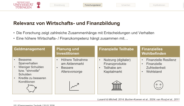 Lucy Haag absolvierte ihren Bachelor und Master of Education mit den Hauptfächern Wirtschaftswissenschaft und Englisch an der Universität Tübingen. Während ihres Studiums war sie als studentische Hilfskraft am Lehrstuhl für Ökonomische Bildung und Wirtschaftsdidaktik tätig. Seit Oktober 2022 arbeitet sie dort als wissenschaftliche Mitarbeiterin. In ihrer Promotion beschäftigt sie sich mit dem Gender Gap in der ökonomischen Kompetenz von Lernenden und untersucht dabei zentrale Einflussfaktoren auf die Entwicklung ökonomischer Kompetenzen. Der Vortrag überzeugte durch eine klare Struktur, hohe wissenschaftliche Fundierung und einen gelungenen Transfer in die Praxis.