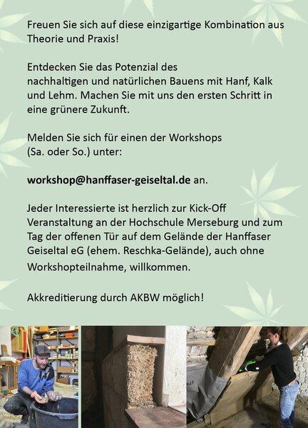 ...unter diesem Motto lädt die Hanffaser Geiseltal eG im September zu einem interaktiven und abwechslungsreichen Workshop rund um das Thema "Bauen mit Hanf" ein.