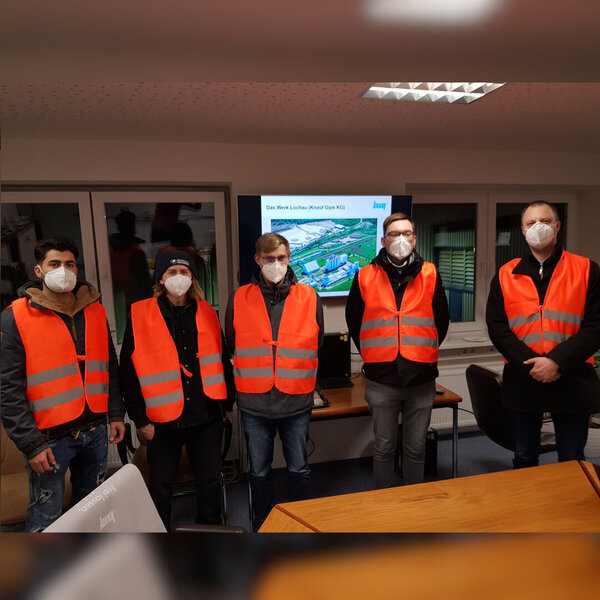 Im Rahmen des Moduls Modellbildung/ Simulation bearbeiten derzeit Studierende des Master-Studiengangs Automatisierungstechnik und Informatik ein Lehr- und Forschungsprojekt zur Modellierung eines Gipstrockners im Werk Lochau der Firma Knauf Gips KG. Ziel des Modells ist es, einen effizienteren und energiesparenderen Betrieb des Trockners zu ermöglichen. Im Rahmen der Zusammenarbeit besuchten sie nun, unter strengen 2G+ Bedingungen, mit ihrem Betreuer Dr. Andreas Ortwein, Professor für Prozessautomation und Gebäudeautomation an der Hochschule Merseburg, das Werk der Firma Knauf Gips in Lochau. Dort konnten sie sich selbst ein Bild machen und verschiedene technische Fragestellungen direkt mit dem Betriebsleiter Patrick Mittendorf und seinem Team besprechen.