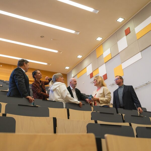 Rechtzeitig zum Beginn des Wintersemesters 2025/26 wurde der grundlegend modernisierte Hörsaal 2 eingeweiht. Mit der Neugestaltung beauftragte die Hochschule das Büro für Architektur & Design Köstler & Placek, das die Aufgabe hatte, Ergonomie, Funktionalität und Komfort des Raumes deutlich zu verbessern und die Raumqualität an aktuelle Anforderungen anzupassen.