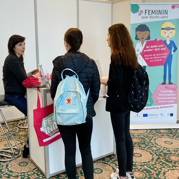 Mit über 40 geplanten Gesprächsterminen zu den Themen Berufsorientierung, Workshops und zum FEMININ Science Camp (08.-11.08.2023) waren die beiden Messetage bereits gut ausgefüllt. Hinzu kamen noch zahlreiche spontane Gespräche mit Messebesucher*nnen, die an unserem Stand Halt machten und sich besonders vom farbenfrohen Banner und den tollen pinken FEMININ-Beuteln angesprochen fühlten. "Wo kann ich mich anmelden?", hörte das FEMININ-Team an diesen Tagen nicht nur einmal – gleich mehrere Schülerinnen wollten gleich am Messestand die Anmeldung für das in einem Monat anstehende Science Camp vornehmen.