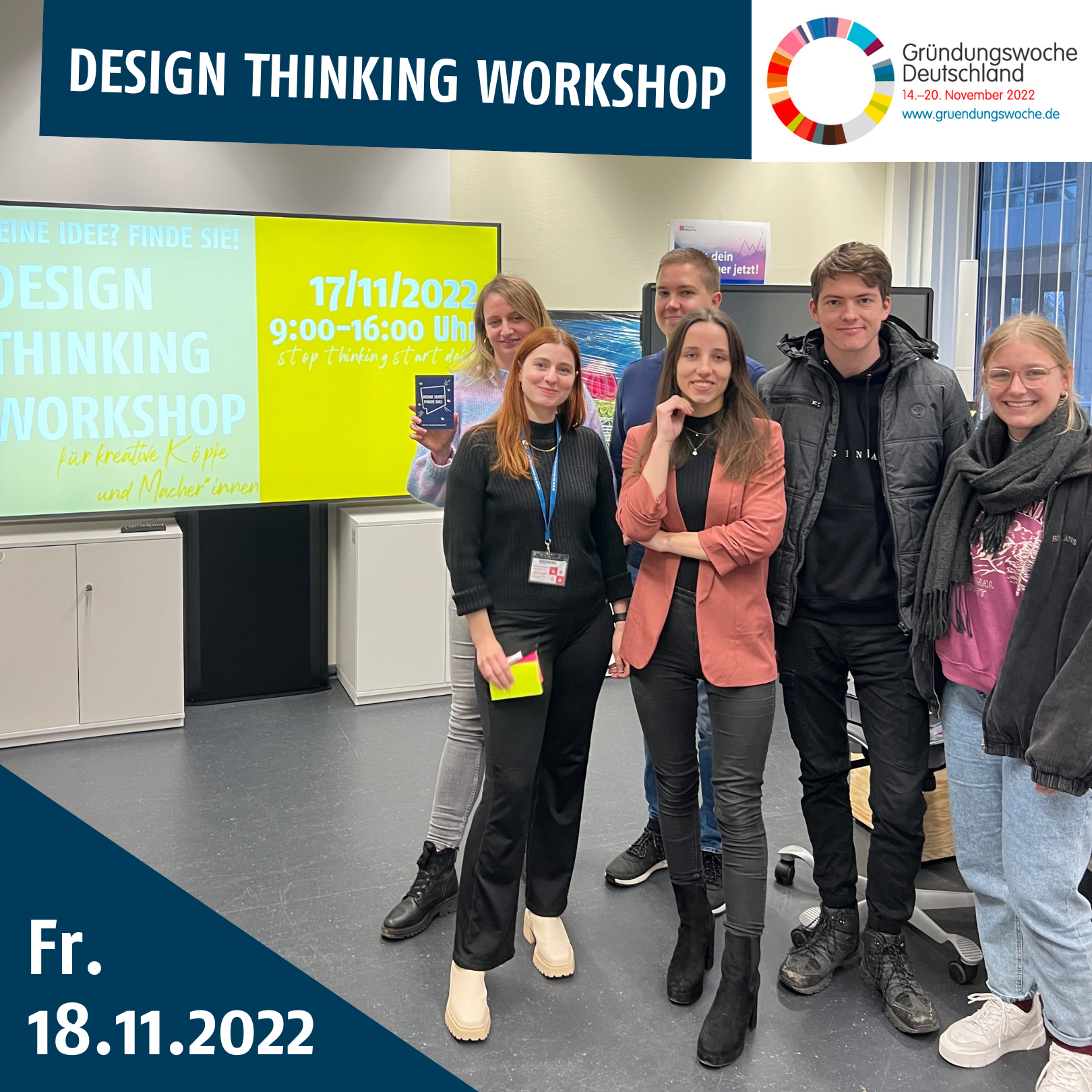 Am 18.11.2022 fand die Gründungswoche 2022 mit dem Design Thinking Workshop des HoMe Gründerservice, angeleitet von Maria Riemer und Linda Rabisch, ihren würdigen Abschluss. Von 09:00-16:00 Uhr wurden hier anhand der Design Thinking Methode Schritt für Schritt nachhaltige und soziale Ideen entwickelt.