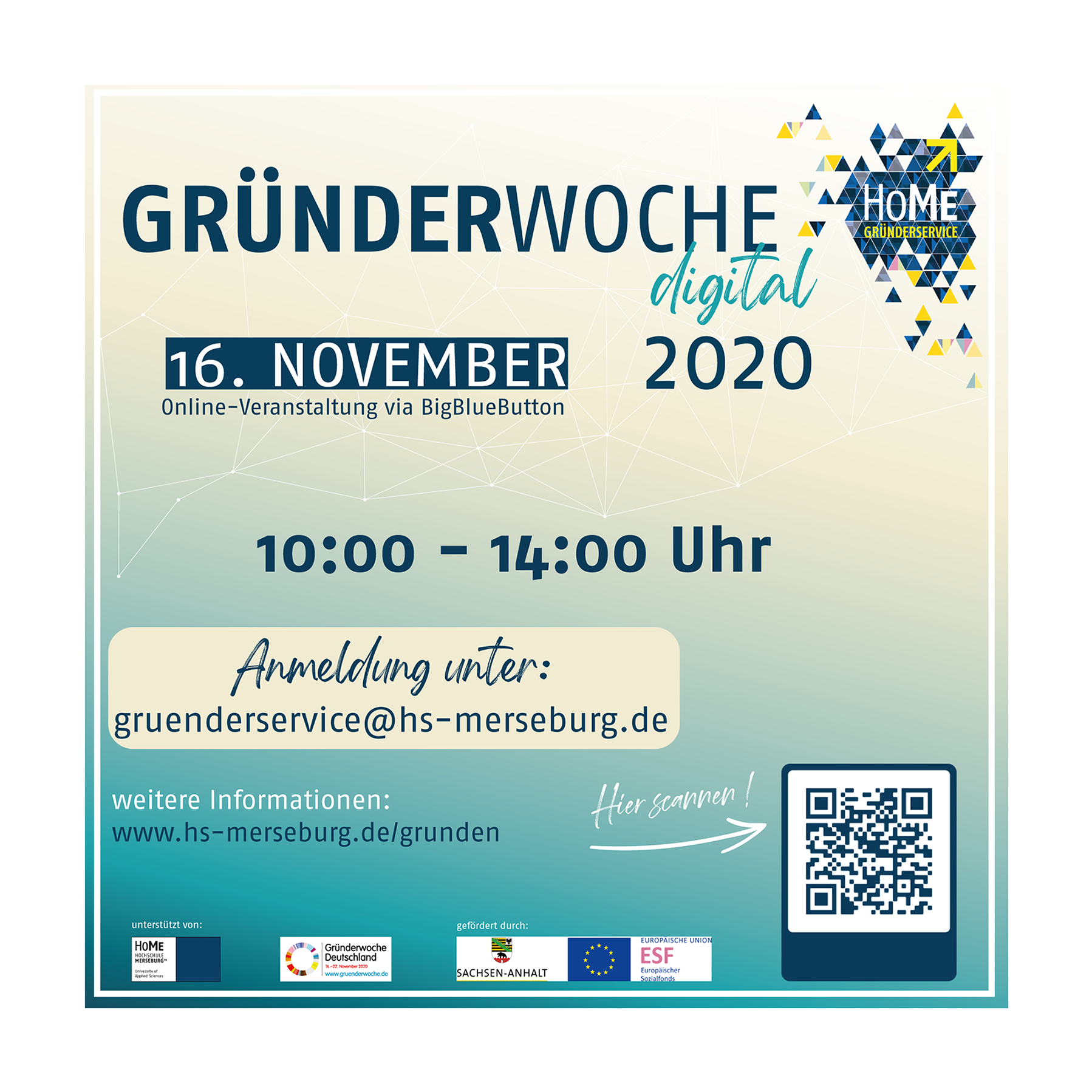 Der HoMe Gründerservice richtet in diesem Jahr erstmals die Gründerwoche digital 2020 an der Hochschule Merseburg aus.