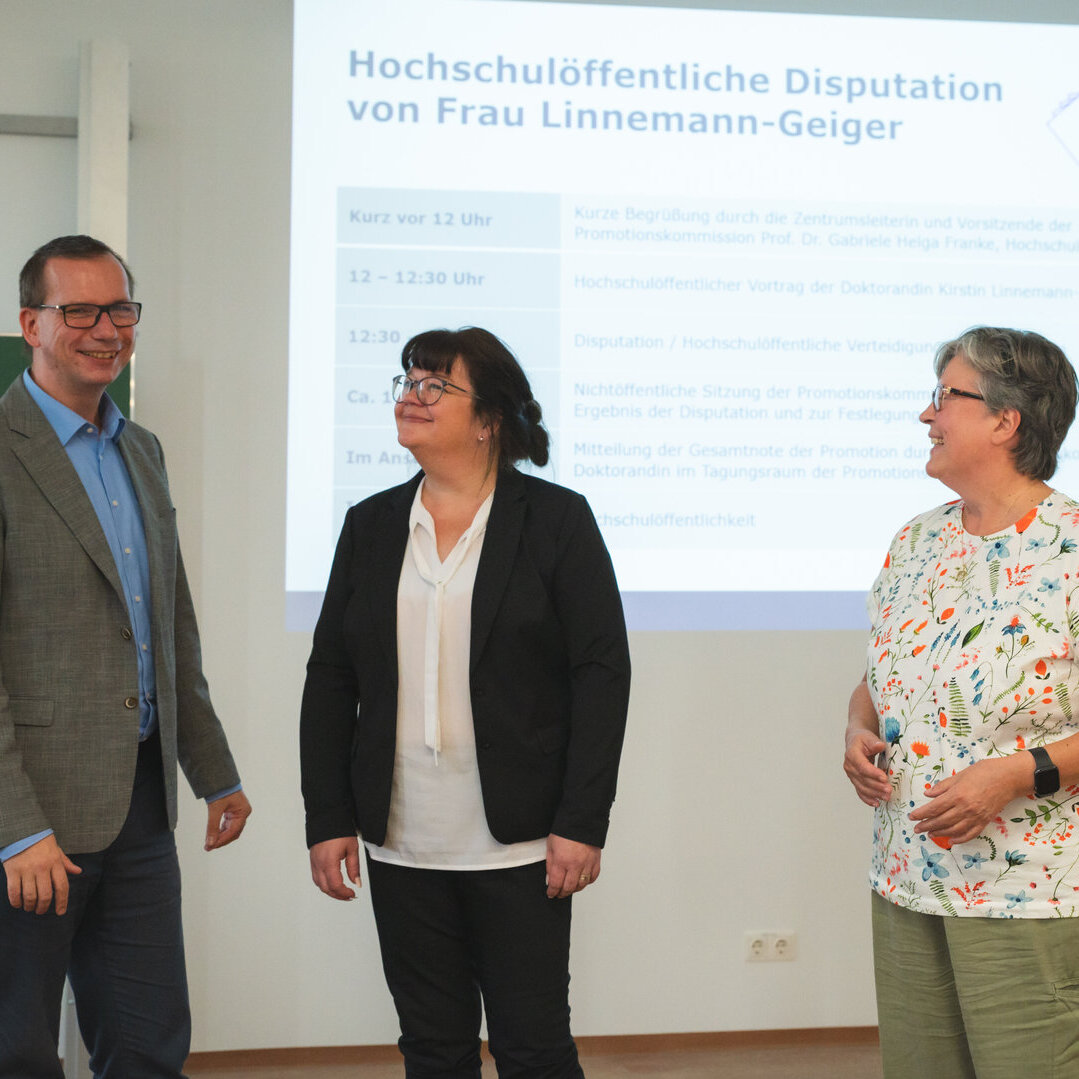 Kirstin Linnemann-Geiger schließt als erste Promovierende ihre Promotion am Promotionszentrum für Sozial-, Gesundheits- und Wirtschaftswissenschaften mit großem Erfolg ab.