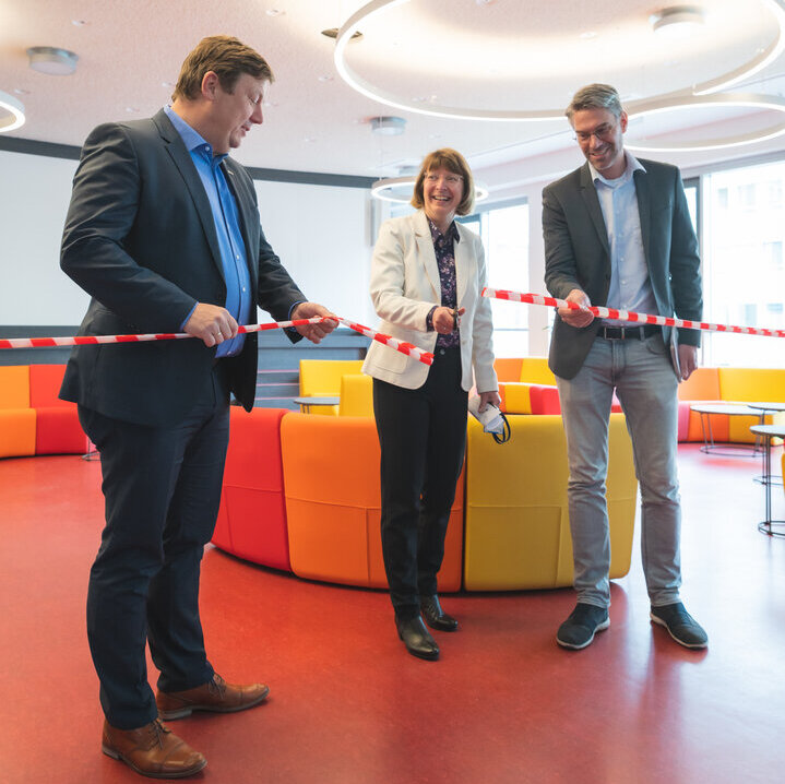 Am Dienstag, 25. April, wurde das umgestaltete Bibliotheksfoyer für die Hochschulöffentlichkeit eingeweiht. Die Umgestaltung des Foyers ist ein wichtiger Meilenstein der vorangetriebenen Campusentwicklung und trägt den unterschiedlichen Bedürfnissen und Wünschen der Hochschulangehörigen nach einer Stärkung der Campuskultur und Schaffung neuer Begegnungsräume Rechnung.