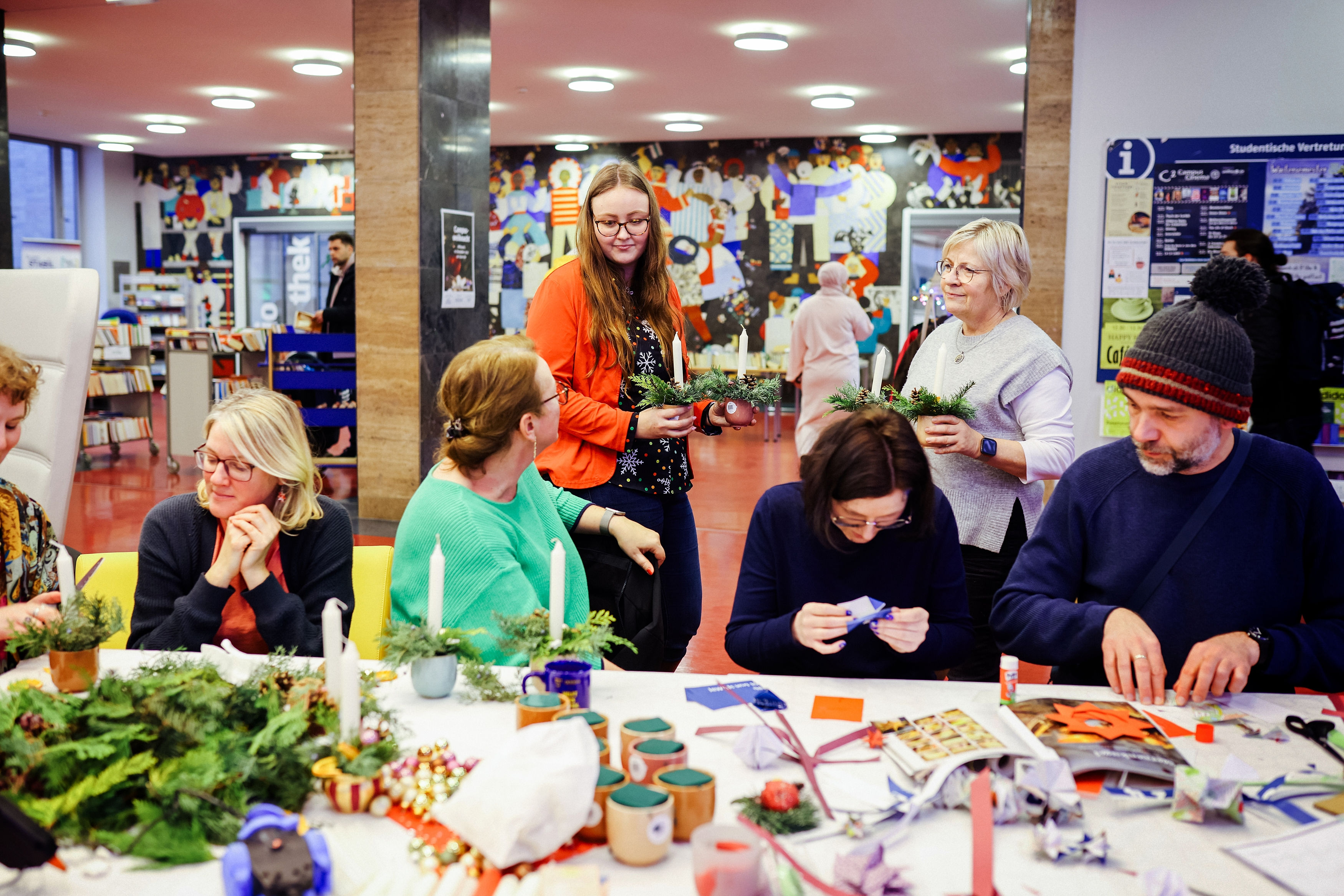 Begleitend dazu gab es zahlreiche Kreativangebote beispielsweise vom Zukunftswerkstatt Mitteldeutschland und dem International Office. Der Bücherbasar der Hochschulbibliothek, eine Soli-Tauschbörse des Green Office Lab zugunsten des Frauenhauses Merseburg sowie floristische Angebote wurden rege genutzt. Der Ausklang erfolgte im Haus der Studierenden bei Glühwein, Punsch und dem Weihnachtskino mit dem Klassiker “Home Alone”.