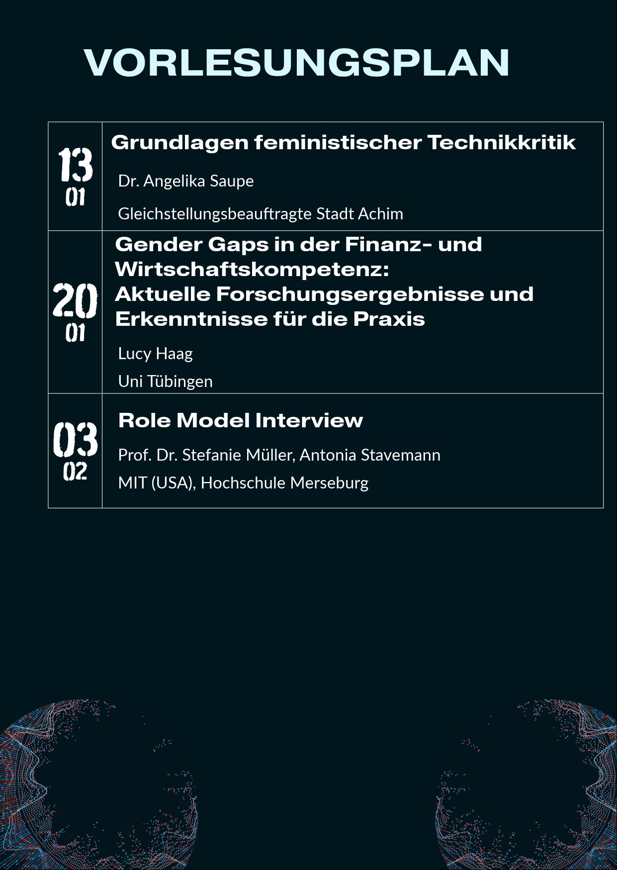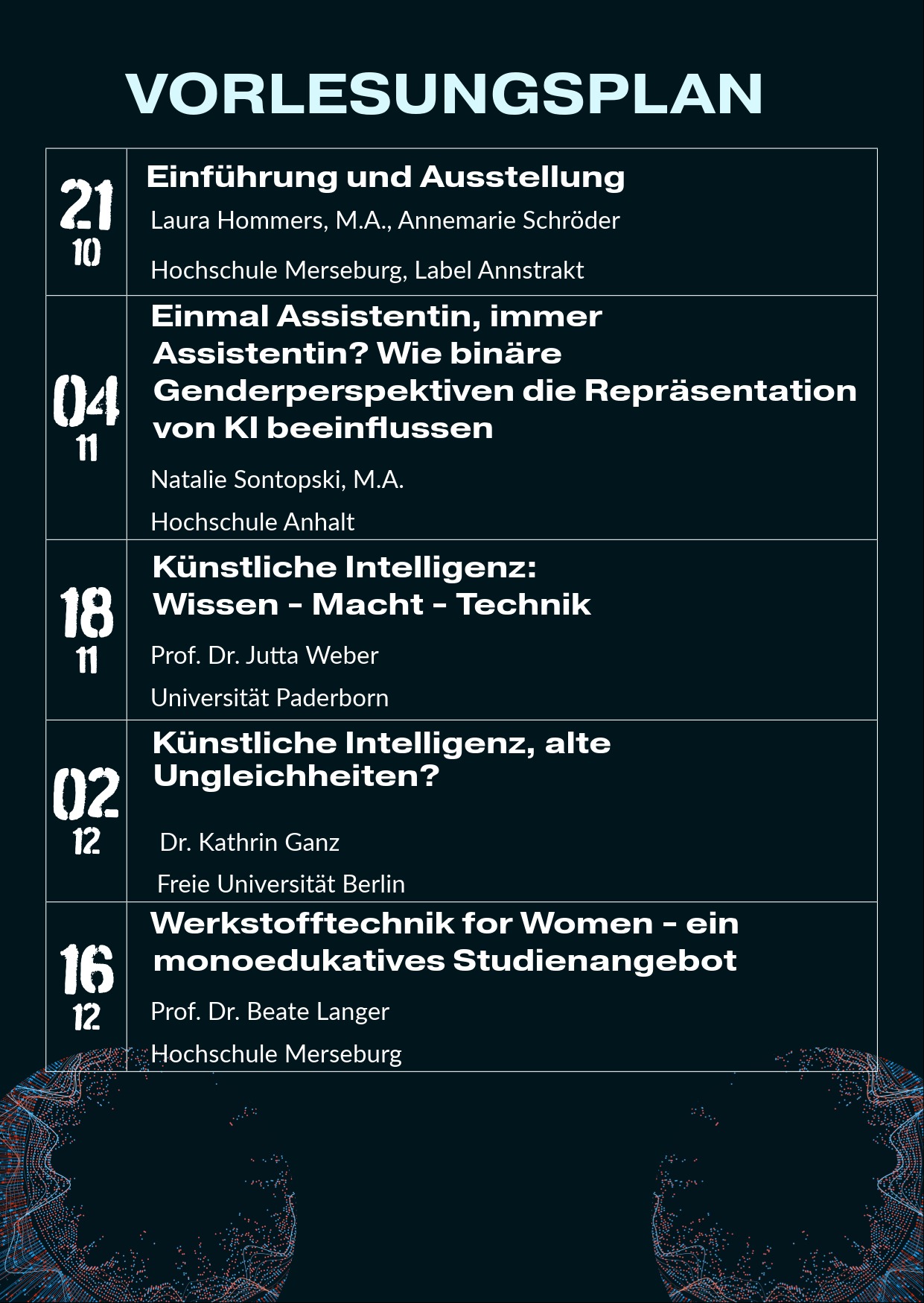 Diese Vorlesung ist im Modul (F)empowering Wissen verortet und verfolgt das Ziel, durch kritische Aufklärung und reflektierte Wissensvermittlung den Zugang zum Feld der Technik insbesondere für Frauen* zu erweitern und zu stärken. Sie unternimmt eine Reise von den Grundlagen feministischer Technikkritik hin zu vielfältigen Perspektiven auf den gegenwärtigen Einsatz von Künstlicher Intelligenz. In verschiedenen Vorträgen werden die komplexen Wechselverhältnisse zwischen Technik, Geschlecht, Macht und Wissen sowie deren Einfluss auf die heutige Arbeitswelt kritisch beleuchtet. Darüber hinaus werden Ansätze vorgestellt, wie mehr Frauen* für das Feld der Technik gewonnen werden können und welche Unterstützungsangebote den Studienerfolg nachhaltig sicherm.