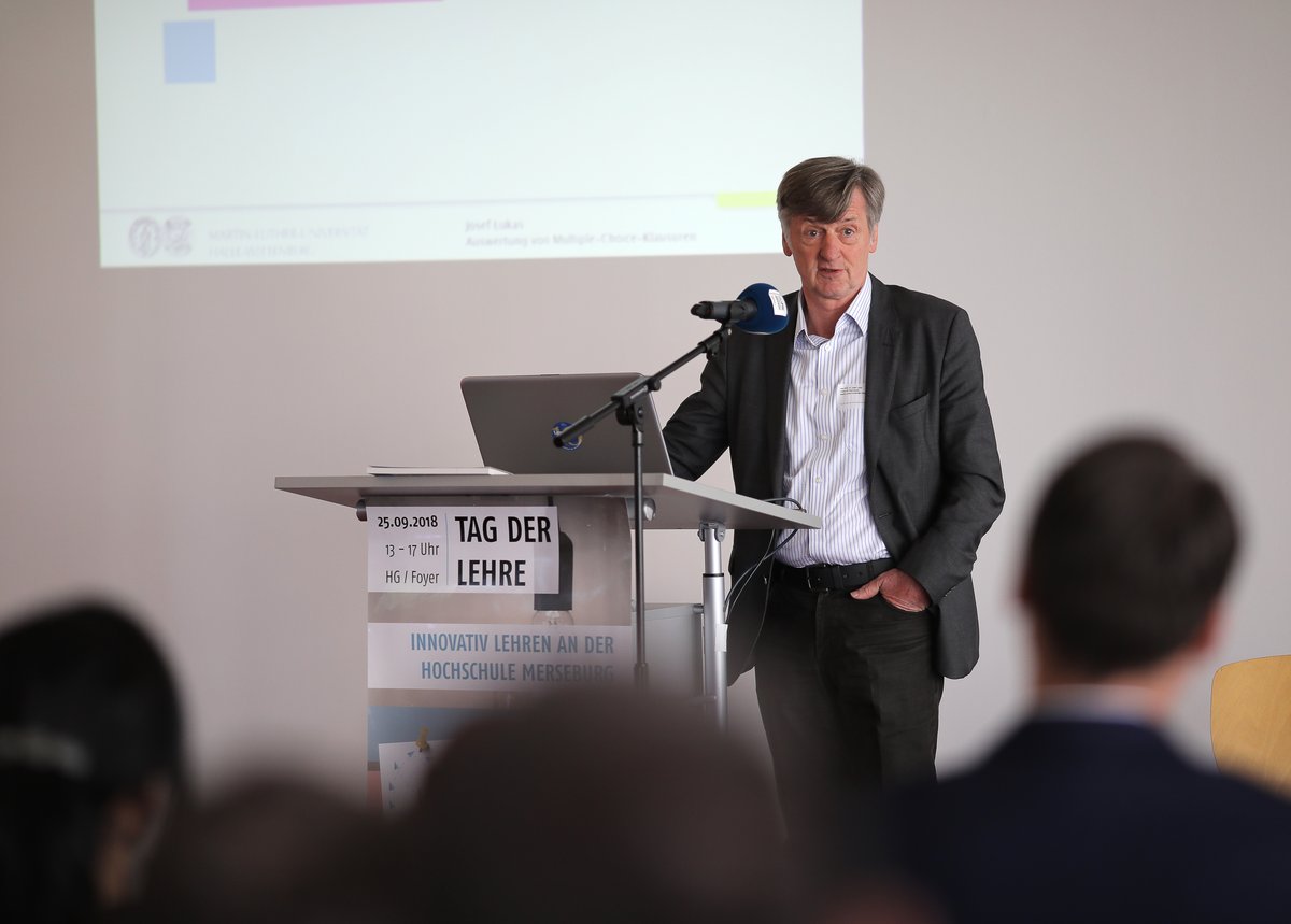 Gemeinsam mit Lehrenden und externen Gästen wurde zum Tag der Lehre am25. September 2018 über technische Neuerungen sowie aktuelle Unterstützungsangebote von innovativer Lehre an der Hochschule Merseburg informiert. Lehrende berichteten über den Einsatz von ILIAS und EvaExam als Prüfungs- und Testplattform und gemeinsam mit Ihnen wurde über die Vor- und Nachteile dieser beiden Tools diskutiert. Prof. Josef Lukas von der Martin-Luther-Universität Halle-Wittenberg gab zudem einen Einblick in die Erstellung und Auswertung von Multiple-Choice-Klausuren. Nach der Kaffeepause und der Posterschau von innovativen Lehr-/Lernprojekten an der Hochschule, erhielten die Teilnehmer*innen einen Überblick über aktuelle Regelungen und Weiterbildungsangebote für E-Tutorien. Wie diese bereits erfolgreich eingesetzt werden, zeigten Lehrende und Tutoren in einem Vortrag näher auf.