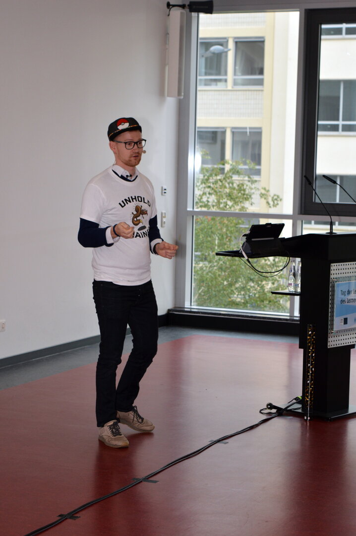 Zum Tag der Lehre und des Lernens konnten sich die Teilnehmer*innen über zahlreiche Angebote freuen, die sowohl auf die Interessen der Lehrenden als auch der Studierenden zugeschnitten waren. Als Schnittstelle dieser Zielgruppen konnten wir den Science Slammer Dr. Daniel Hunold von der Uni Greifswald gewinnen, der den Tag humorvoll eingeleitet hatte.