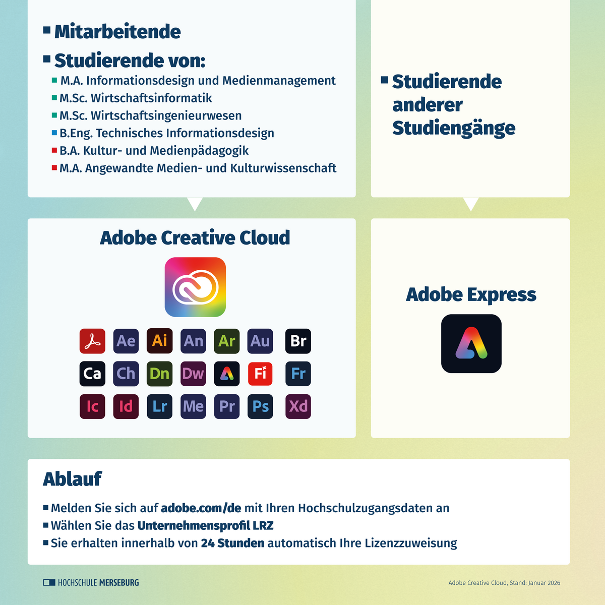 Neben allen Mitarbeitenden und allen PC-Pools finanziert die Hochschule Merseburg als eine von sehr wenigen Hochschulen in Deutschland auch die Lizenz für 500 Studierende ausgewählter Studiengänge. Zudem haben seit Dezember 2025 alle Studierenden Zugriff auf Adobe Express, dem webbasierten Tool für schnelles und einfaches Erstellen von Grafiken, Videos und Social-Media-Inhalten.