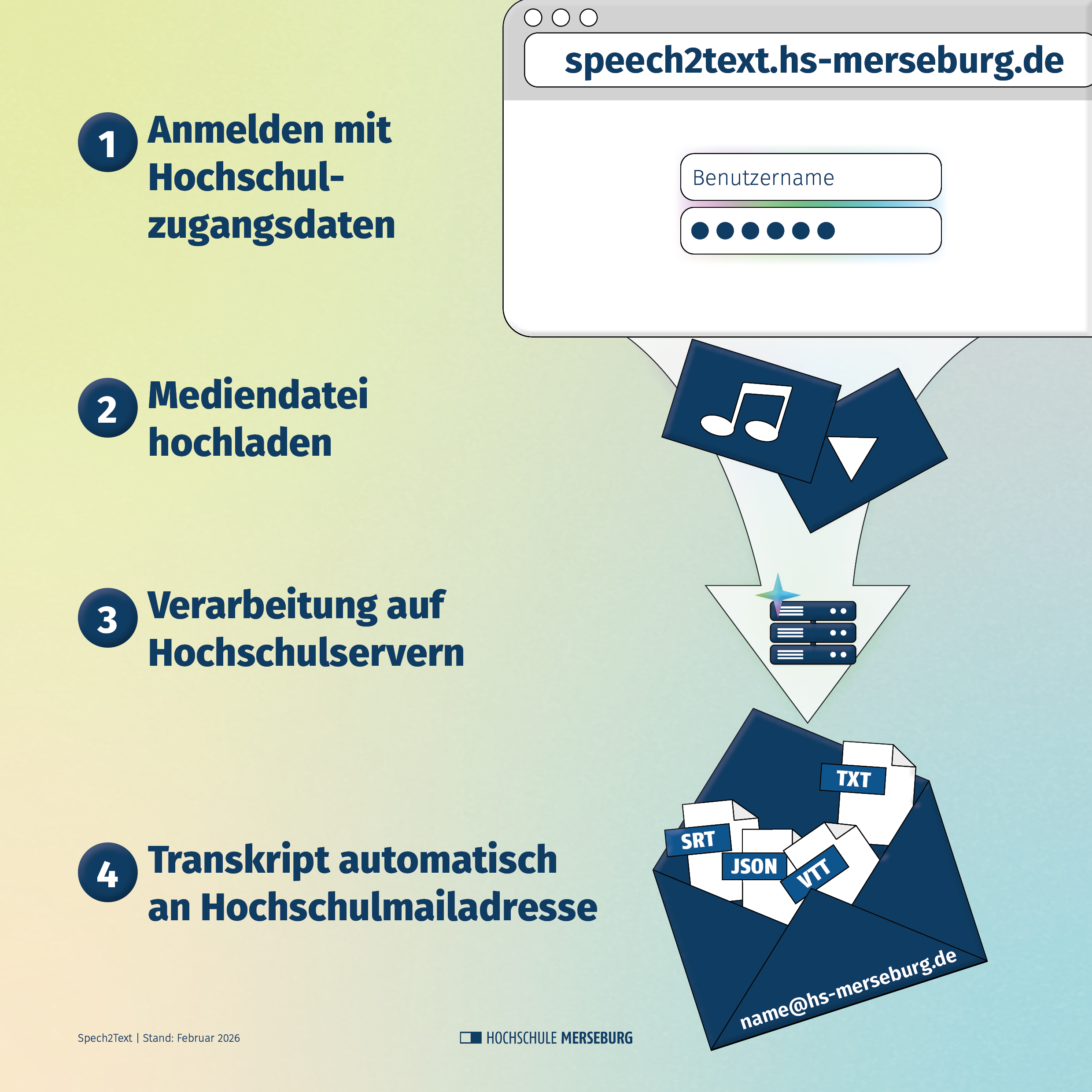 Die Hochschule bietet eine eigene Web-App zur Umwandlung von gesprochener Sprache in schriftlichen Text. Melden Sie sich einfach mit Ihren Zugangsdaten (HoMe-Portal) an. Laden Sie anschließend Ihre Audiodatei hoch – der Dienst transkribiert den Inhalt automatisch. Sobald die Transkription abgeschlossen ist, wird Ihnen das fertige Text-Transkript per E-Mail an Ihre Hochschuladresse zugestellt.