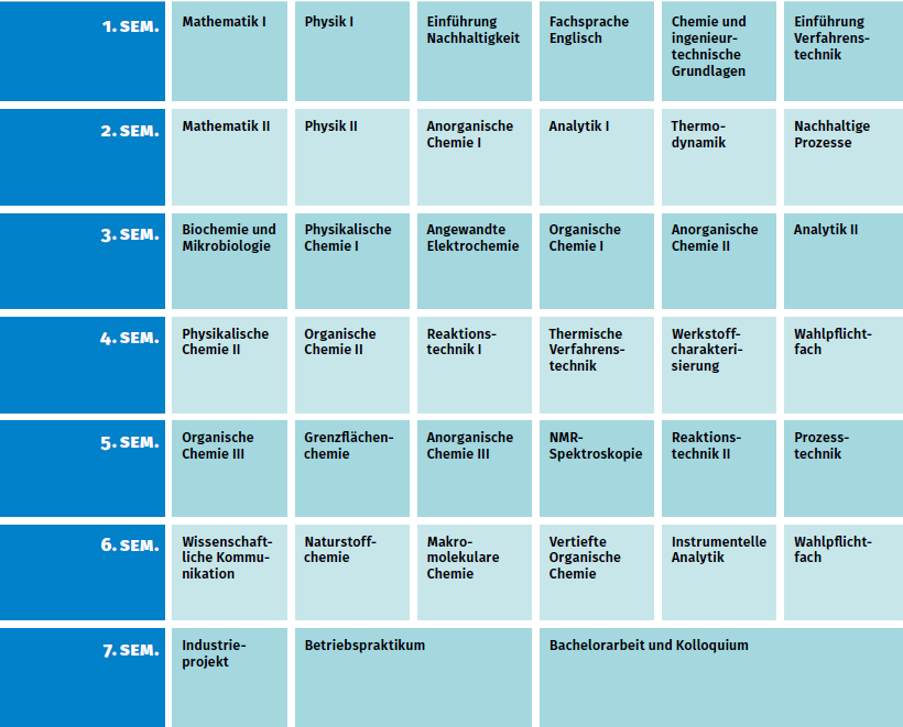 - Lehrinhalte: Prozessanalytik, Datenanalyse, Green Chemistry, Spektroskopie und Strukturaufklärung, Toxikologie, Forschungspraktikum