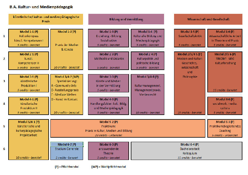 Das Studium ist in sechs Bereiche aufgeteilt: Kunst, Gesellschaft. Bildung und deren Kontexte sowie Forschung. Im Bereich Vertiefung wählen Sie ab dem 3. Semester einen Schwerpunkt, der Ihren Interessen entspricht. Ein Praktikum absolvieren Sie im 5. Semester. Mit einer künstlerischen bzw. medienpraktischen Arbeit sowie mit Ihrer wissenschaftlichen Bachelor-Arbeit schließen Sie das Studium ab. Ein Auslandssemester ist während des Studiums möglich.