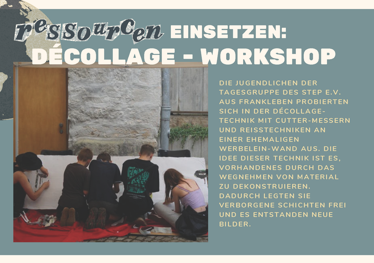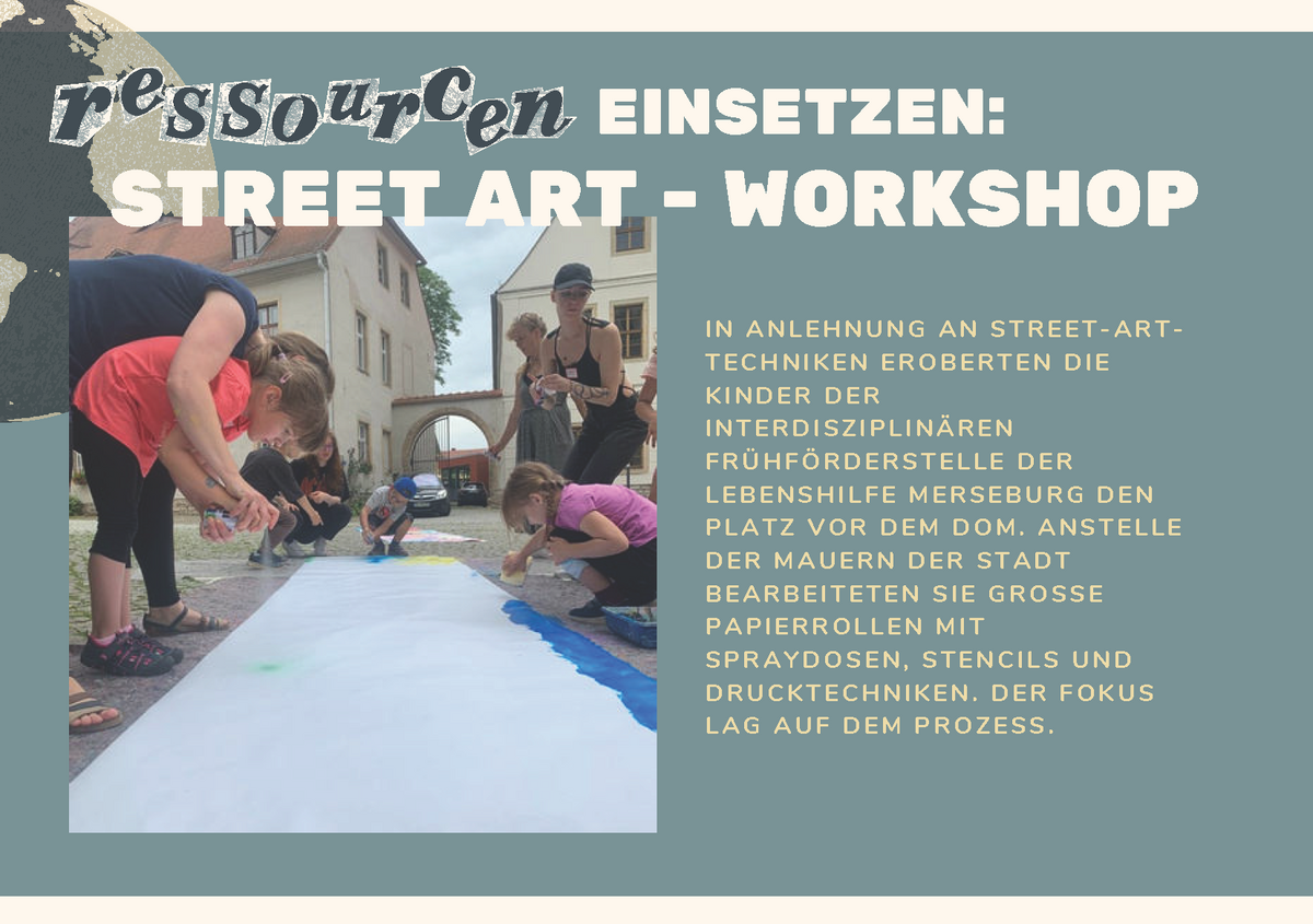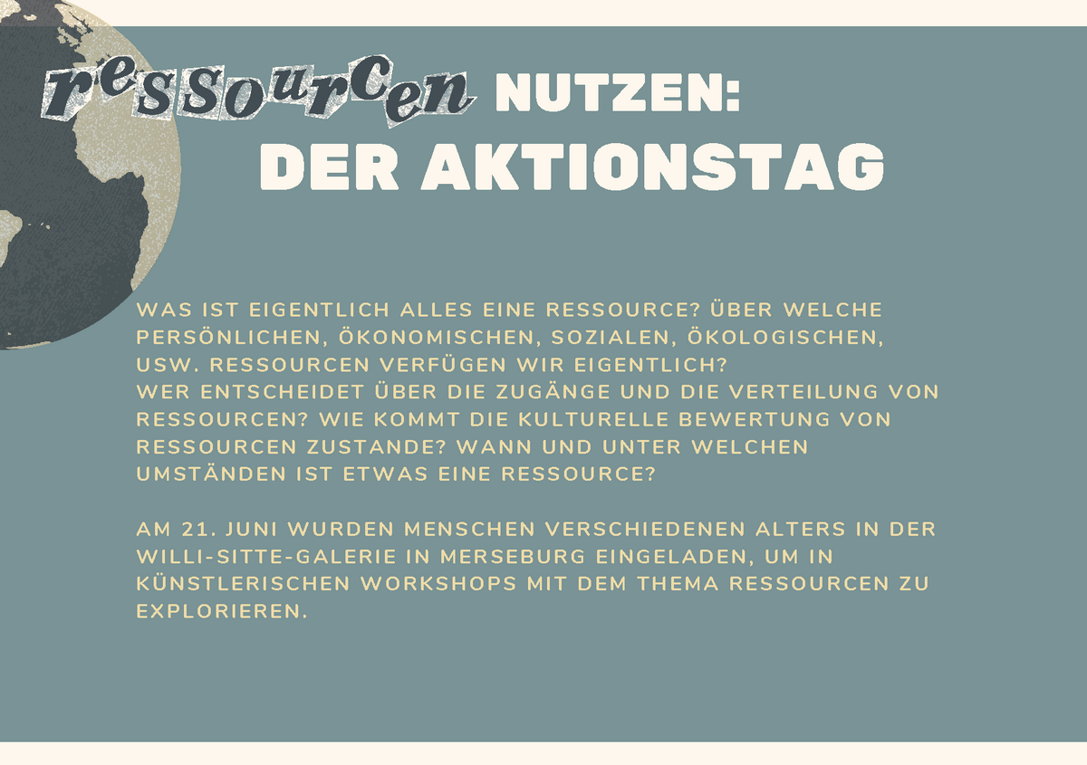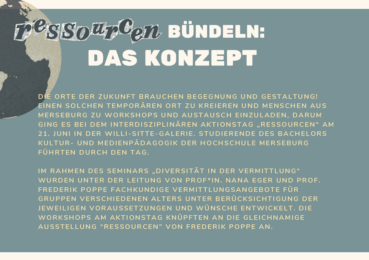 Die Orte der Zukunft brauchen Begegnung und Gestaltung. Einen solchen temporären Ort zu kreieren und Menschen aus Merseburg zu Workshops und Austausch einzuladen, darum ging es bei dem interdisziplinären Aktionstag „Ressourcen“ am 21. Juni in der Willi-Sitte-Galerie. Studierende des Bachelors Kultur- und Medienpädagogik der Hochschule Merseburg führten durch den Tag.
