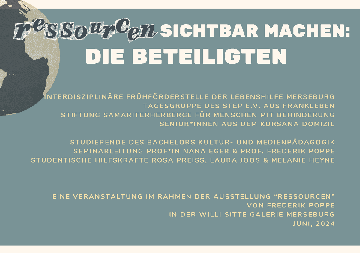 Im Rahmen des Seminars „Diversität in der Vermittlung“ wurden unter der Leitung von Prof.in Nana Eger und Prof. Frederik Poppe fachkundige Vermittlungsangebote für Gruppen verschiedenen Alters unter Berücksichtigung der jeweiligen Voraussetzungen und Wünsche entwickelt. Die Workshops am Aktionstag knüpften an die gleichnamige Ausstellung „Ressourcen“ von Frederik Poppe an.