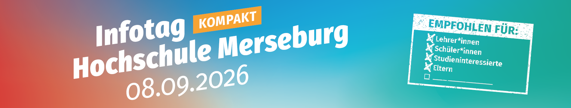 Die Hochschule Merseburg lädt am 08.09.2026  Studieninteressierte zum Infotag kompakt ein. Nähere Informationen und Programm folgen hier ab Juli 2026.